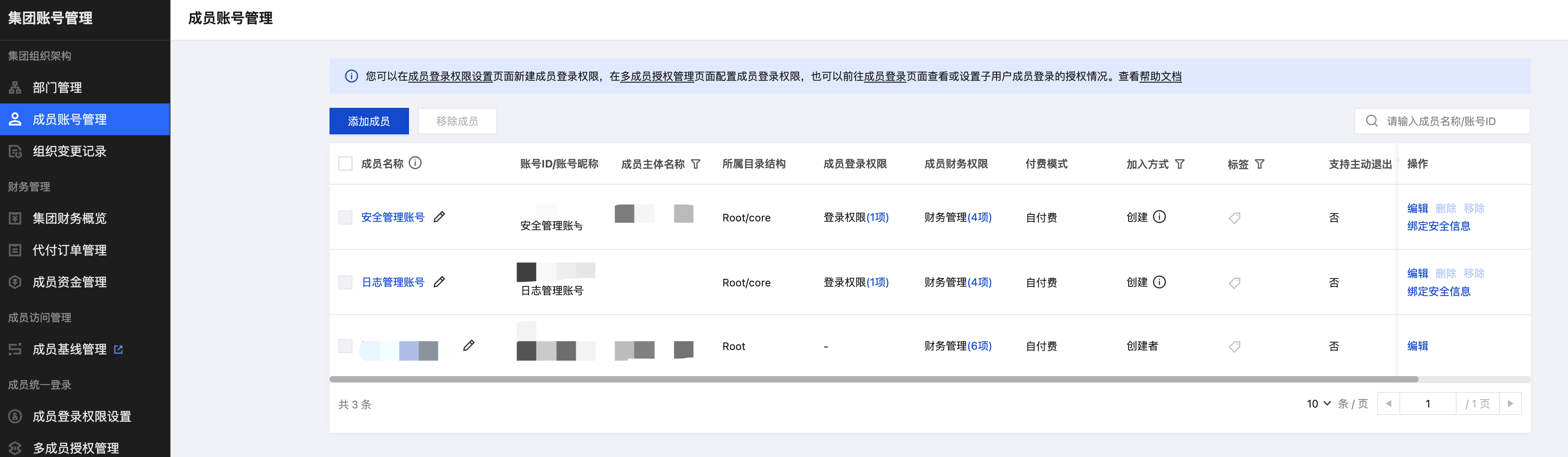 在集团账号管理 > 成员账号管理中,可以查看及编辑成员财务权限和付费模式。