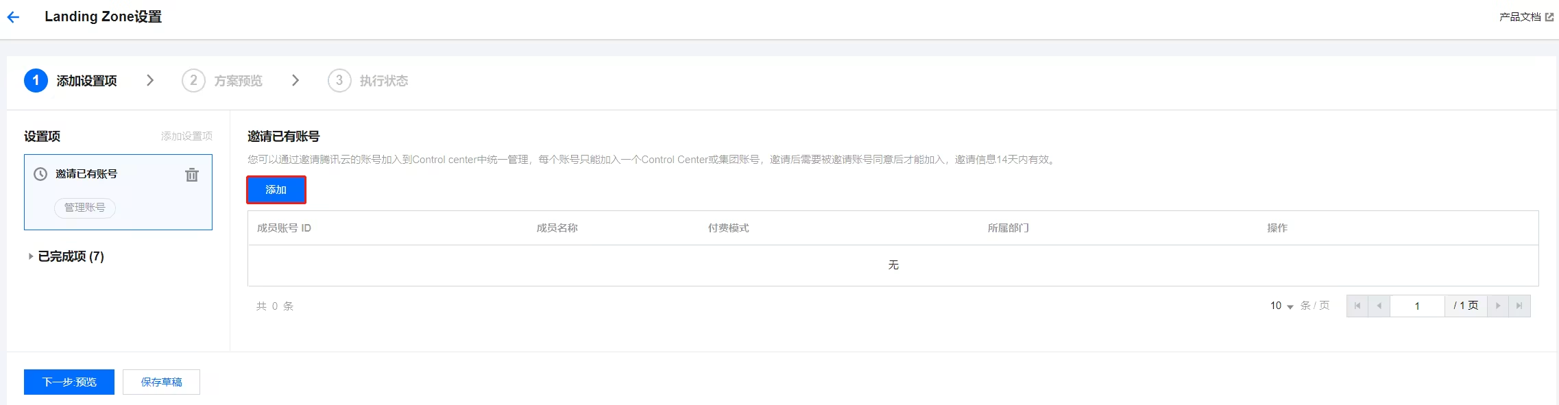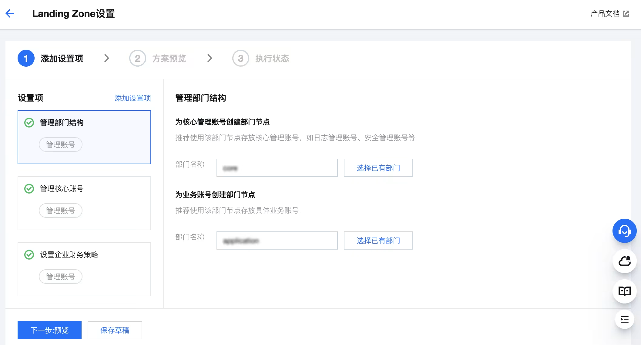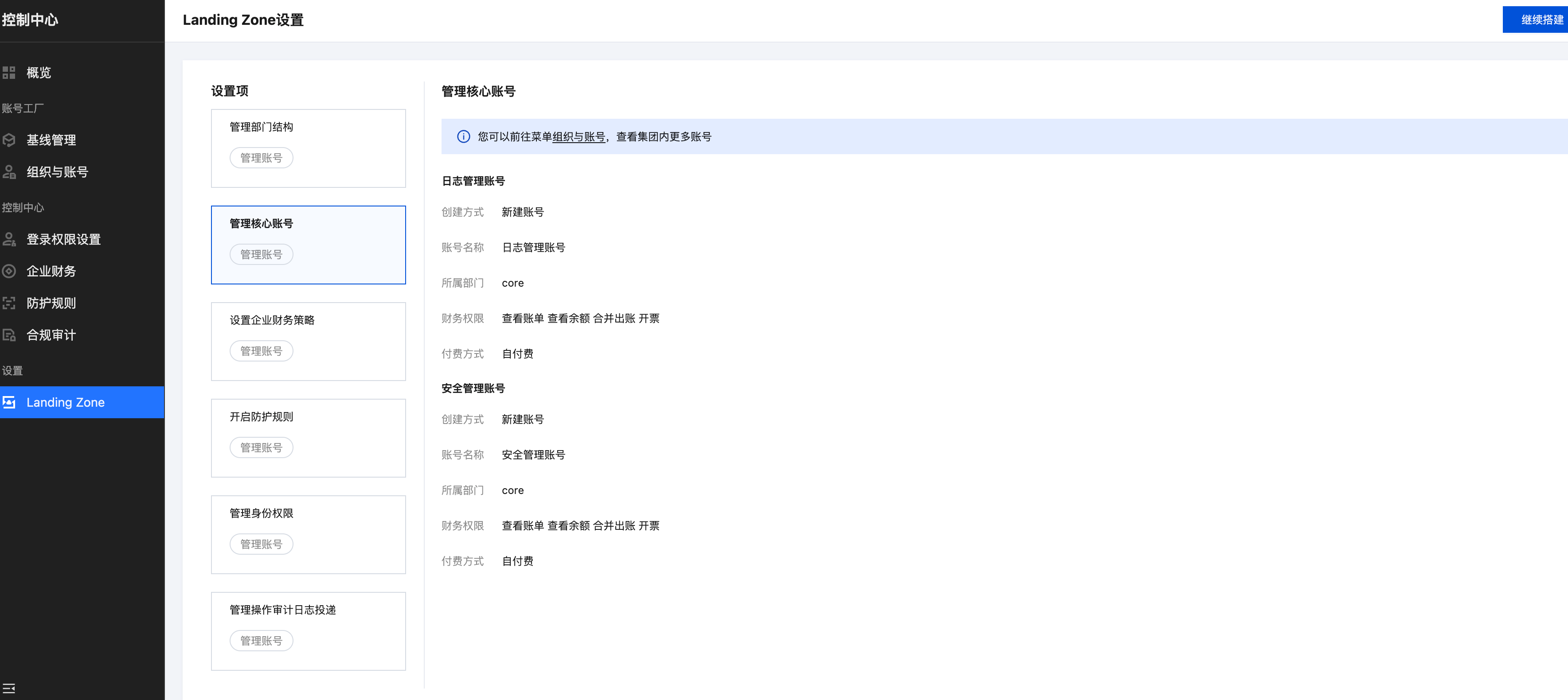 控制中心支持通过步骤化的方式快速完成 Landing Zone 云环境的搭建:快速完成账号结构规划、完成职能管理账号委派及初始化管理规则设置。