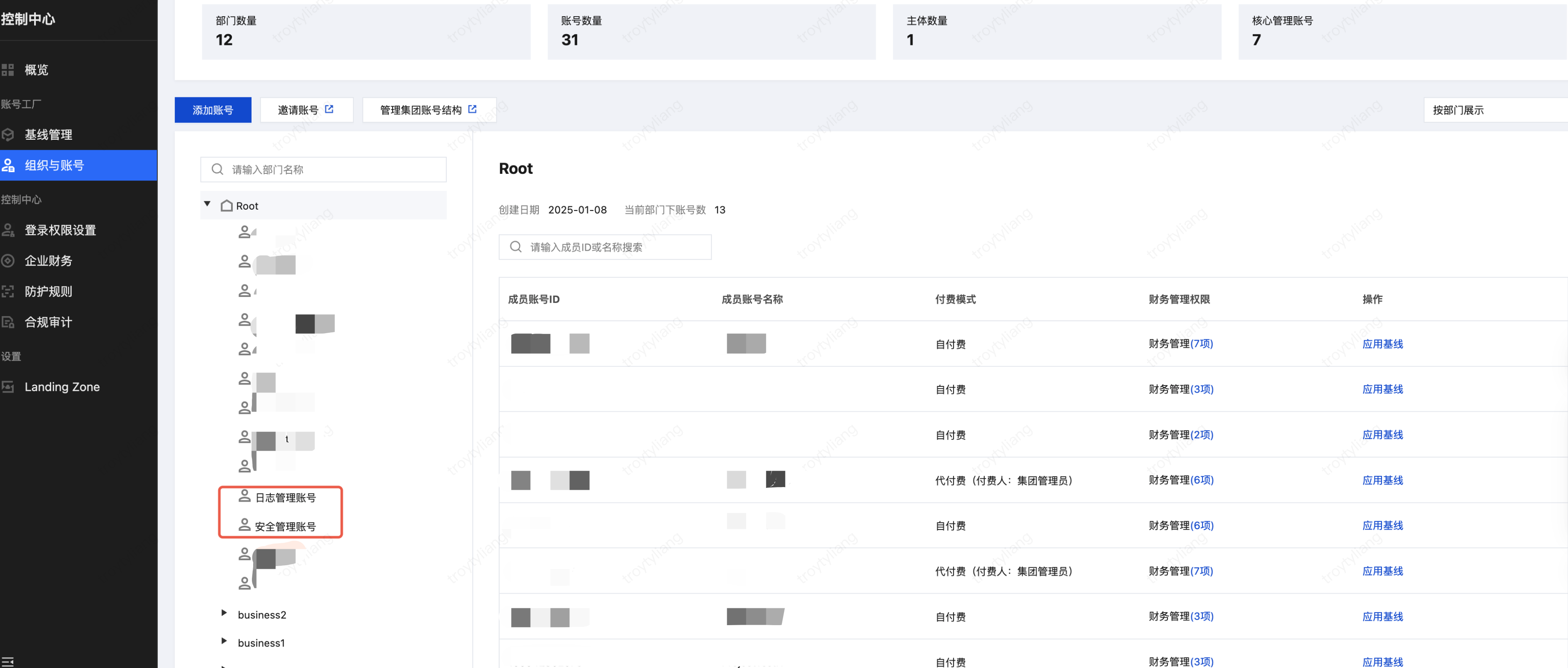 3. 如果您需要对创建的核心账号进行调整:在控制中心 >组织与账号 页面或集团账号管理 > 部门管理 页面,单击对应的成员账号(日志管理账号、安全管理账号),可以对成员账号进行编辑;还可以在集团账号管理 > 成员账号管理 页面,单击添加成员,根据需要新建成员账号。