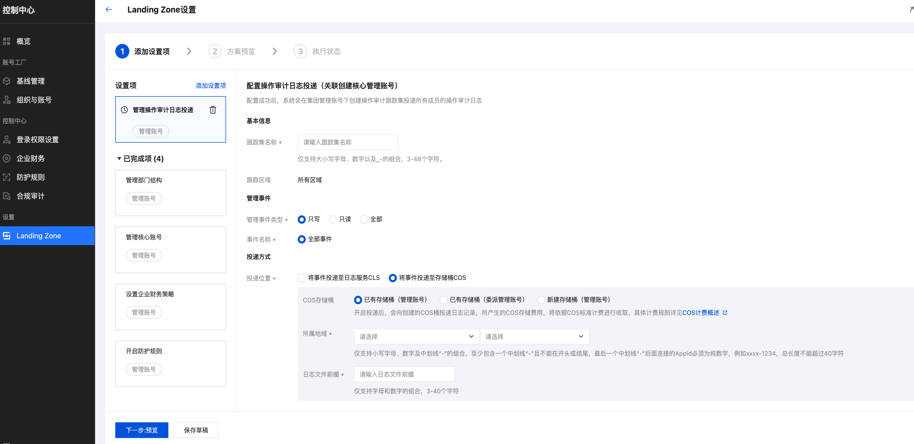 2. 创建跟踪集后,在 Landing Zone 操作审计日志投递设置时可按需选择投递位置:CLS 可选用集团管理员账号下已有实例或新建实例;COS 可选择管理账号已有存储桶、委派管理员账号已有存储桶(需提前委派),或在管理账号下新建存储桶。详情请参见 管理操作审计日志投递。
