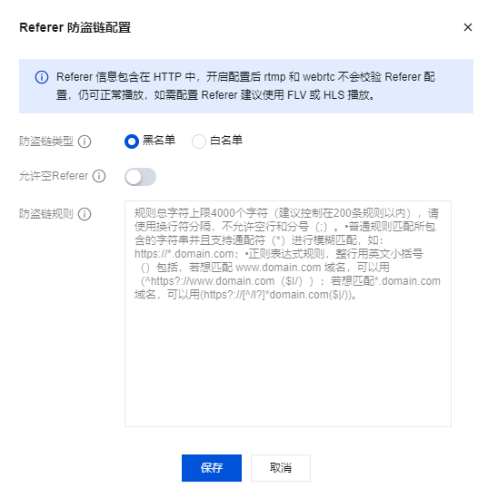 实施方法:进入云直播控制台 > 域名管理 > 选择播放域名 > 访问控制 > 打开 Referer 防盗链 并填写 Referer 内容。