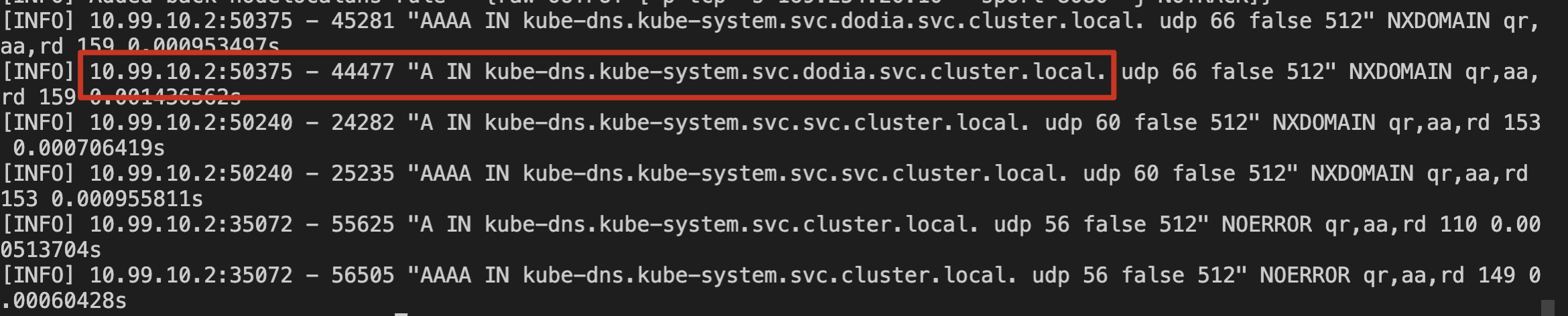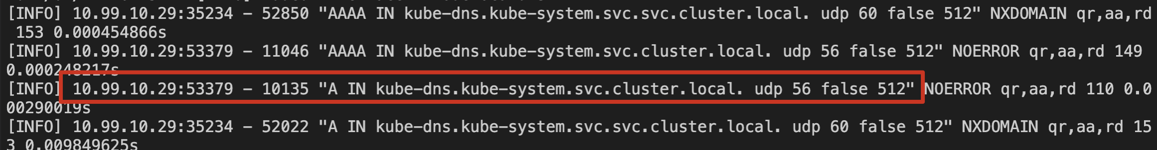 可以确认存量 Pod 对 kube-dns 的解析请求通过了本节点上的 NodeLocal DNS Cache 服务。