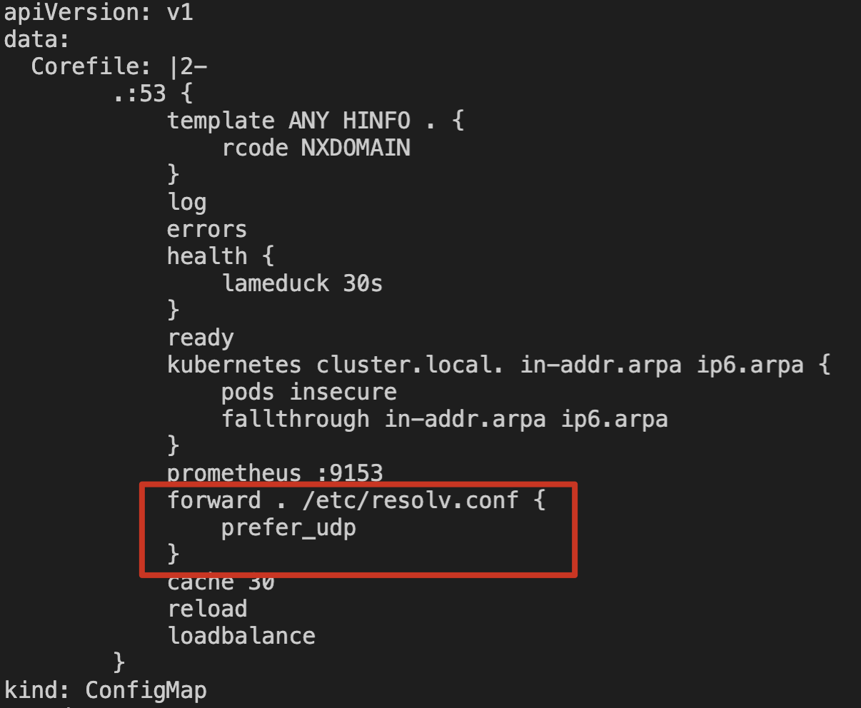 2. 存量集群:如果用户已经部署了 NodeLocal DNS Cache 组件,建议用户配置 CoreDNS 服务的相关 Corefile,添加 prefer_udp 并 reload 配置。示例如下: