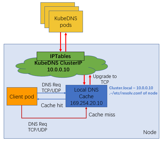 社区版本 NodeLocal DNS Cache 通过 DaemonSet 在集群的每个节点上部署一个 hostNetwork 的 Pod,该 Pod 名称为 node-local-dns,可以缓存本节点上 Pod 的 DNS 请求。如果存在 cache misses,该 Pod 将会通过 TCP 连接请求上游 kube-dns 服务进行获取。原理图如下所示: