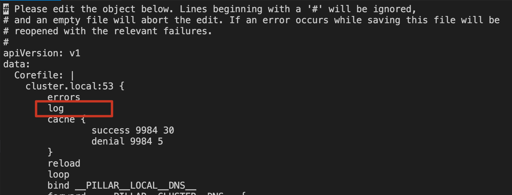 如果您想通过日志验证节点上 NodeLocal DNS Cache 是否代理了本节点的 DNS 请求,需要修改 kube-system 命名空间下 node-local-dns 的 ConfigMap 配置,在对应的 Corefile 配置中添加 log 日志能力。如下图所示: