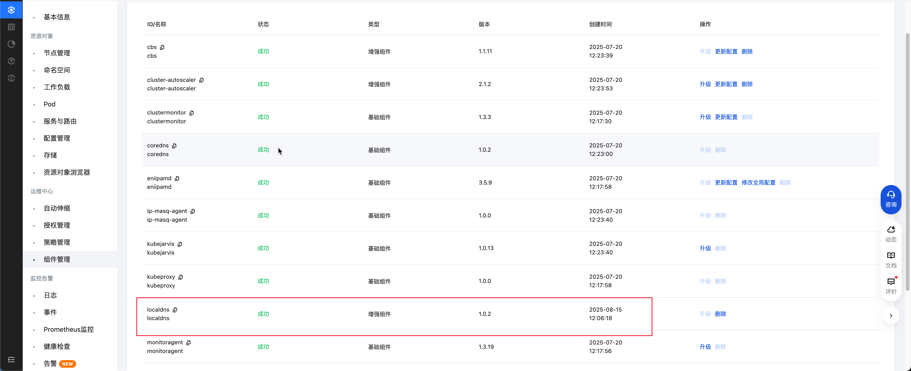 您可以通过 TKE 的组件管理部署安装 Nodelocal DNS Cache,详情请参见 操作步骤。安装完成后,返回组件管理列表页,检查 localdns 组件状态置为成功,如下图所示: