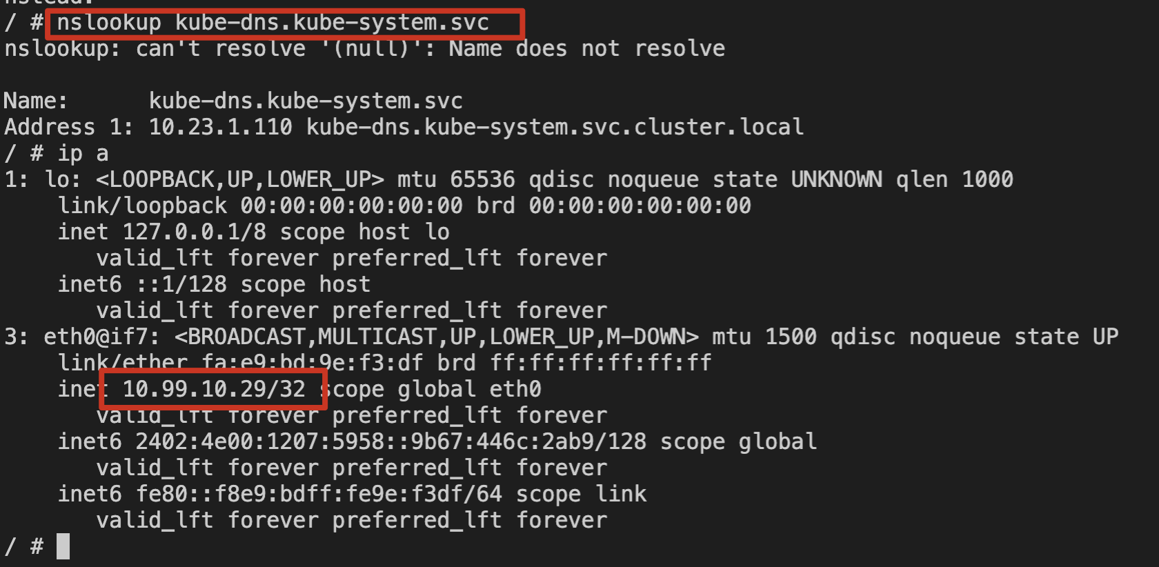 4. 使用 nslookup 命令解析 kube-dns 的 svc。如下图所示: