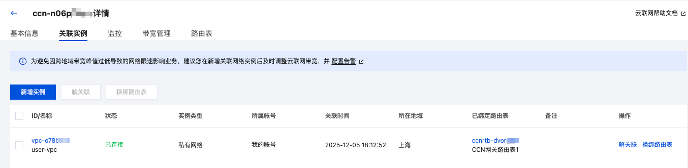 3. 在 CCN 实例详情页面单击关联实例页签,单击新增实例,在关联实例对话框选择用户业务 VPC 以及上述已创建的 CCN 网关路由表1,单击确定,即为当前路由表绑定用户业务 VPC。