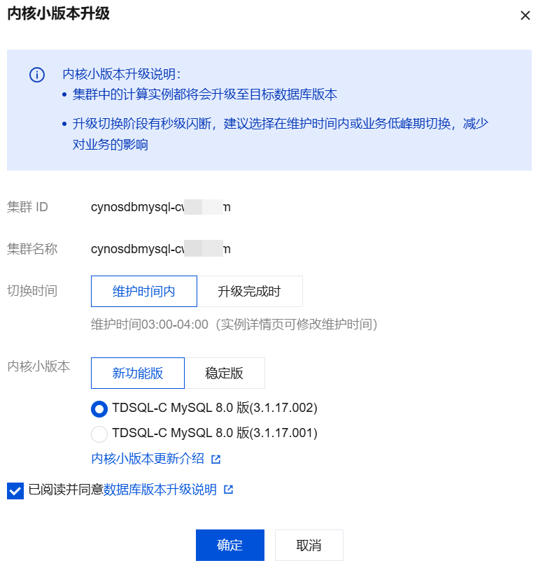 4. 在弹窗下选择切换时间和要升级的目标内核小版本,勾选“已阅读并同意数据库版本升级说明”,单击确定。