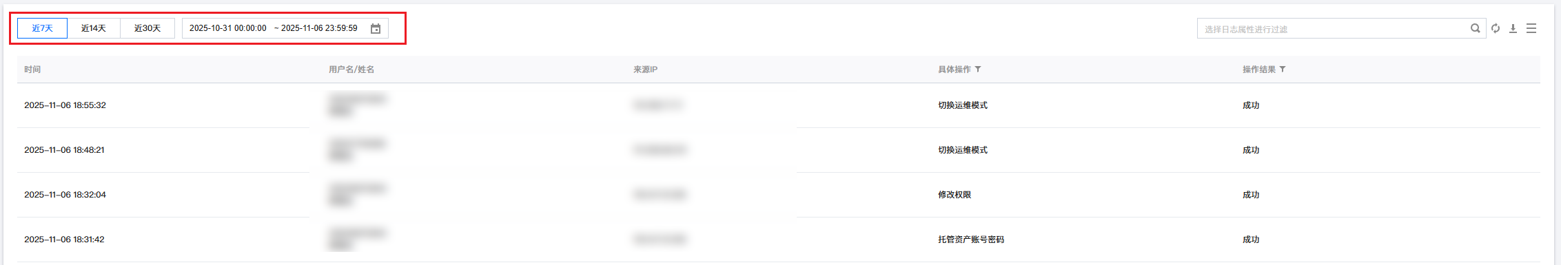 在操作日志页面,您可以单击“时间”切换,查看不同时间段的操作记录。