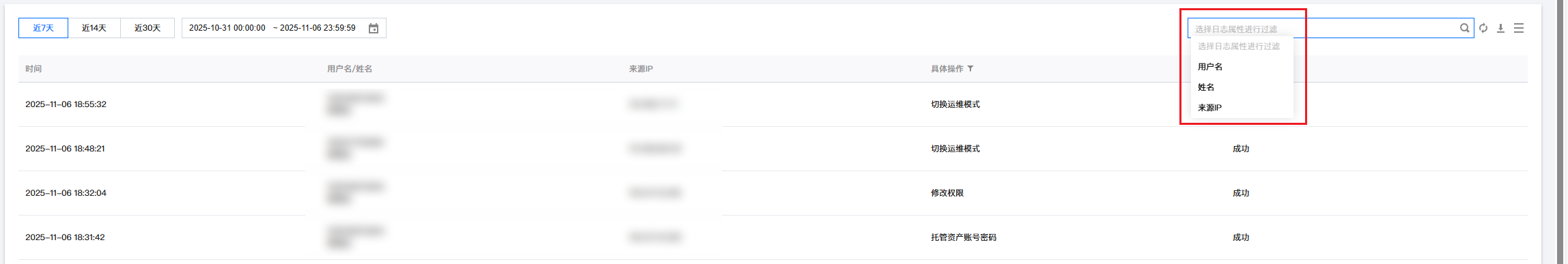 在搜索框中通过日志属性进行筛选,输入用户名、姓名或来源 IP,单击