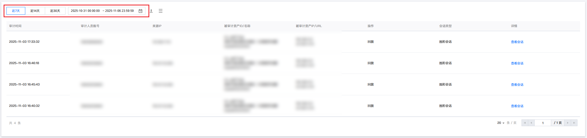 在审计日志页面,您可以通过单击时间切换,查看不同时间段的审计记录。
