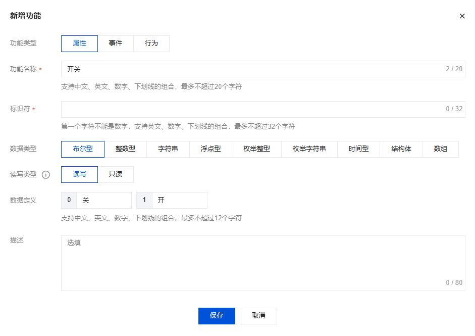 1. 功能类型选择属性,填写功能名称,如“开关”。
