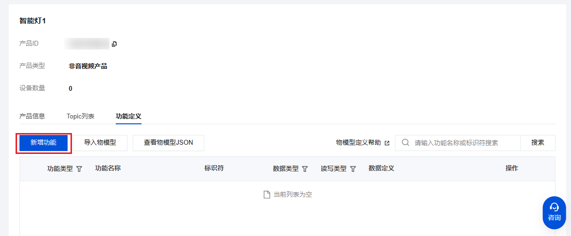 4. 进入对应产品详情页后,选择功能定义,然后单击新增功能。