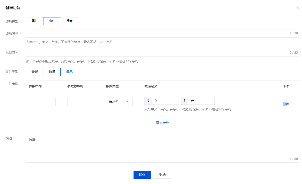功能类型选择事件,填写功能名称。配置填写其他信息后即可保存。例如,选择“事件类型”为“信息”,用户可自定义设备向物联网开发平台发送的事件信息。