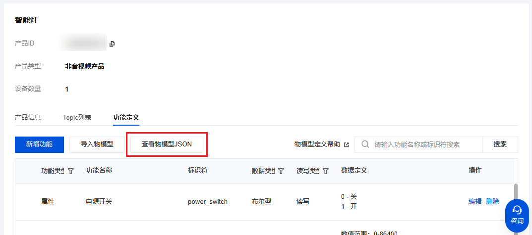 1. 添加完功能后,用户可以在产品详情页的功能定义中单击查看物模型JSON。