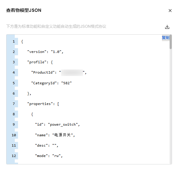 2. 您可查看或下载物模型对应的 JSON 格式。您还可以通过"导入物模型"功能,将复制的 JSON 用于产品间物模型定义的复制。