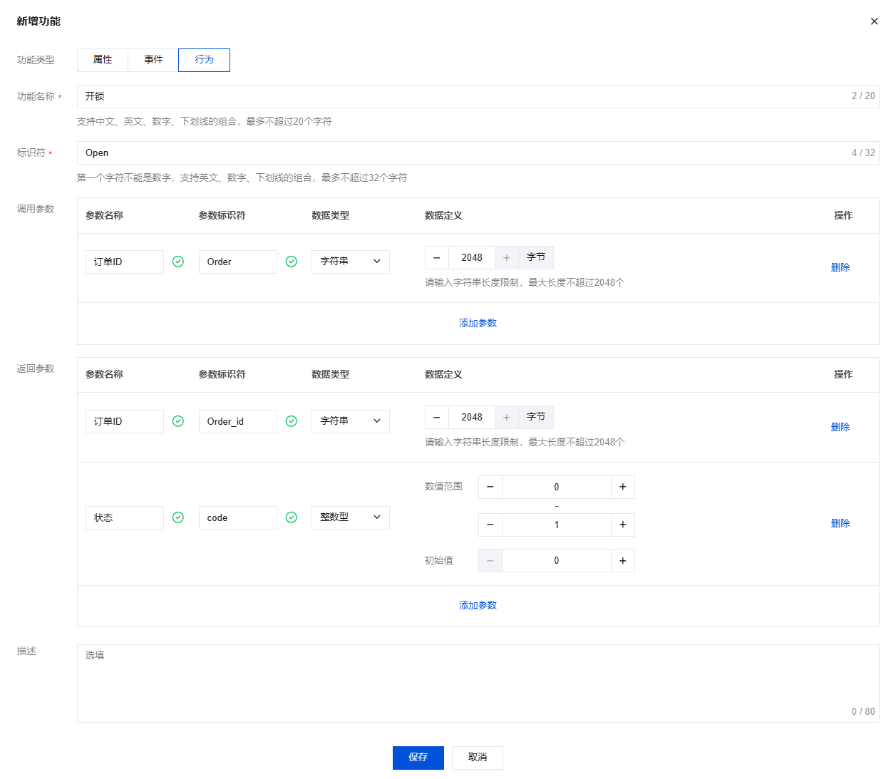 2. 在功能名称录入对应的行为名称,然后定义相关参数。请求参数需要由用户定义,返回参数是设备侧执行完之后上报到物联网开发平台的参数。