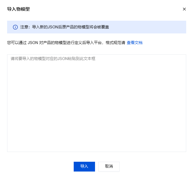 1. 在目标产品详情页的功能定义中单击导入物模型,将复制的某个产品的物模型 JSON 粘贴到文本框中。
