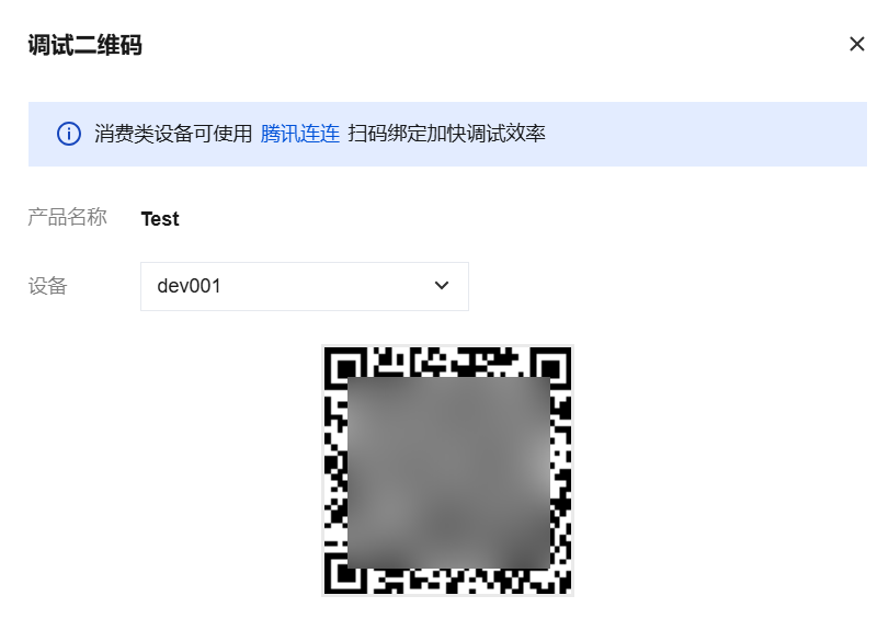 5. 单击操作列中的调试二维码,选择要调试的设备,生成设备绑定的二维码。