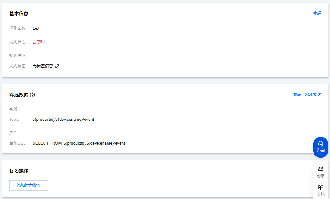 4. 创建成功后,即可自动进入规则详情页面,您可以编辑数据筛选和添加行为操作。
