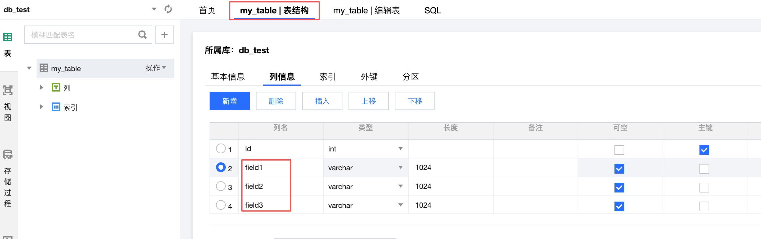 创建表数据库SQL示例:CREATE TABLE my_table (id INT AUTO_INCREMENT PRIMARY KEY,field1 VARCHAR(1024),field2 VARCHAR(1024),field3 VARCHAR(1024),json_field JSON,int_field1 INT,int_field2 INT,int_field3 INT);