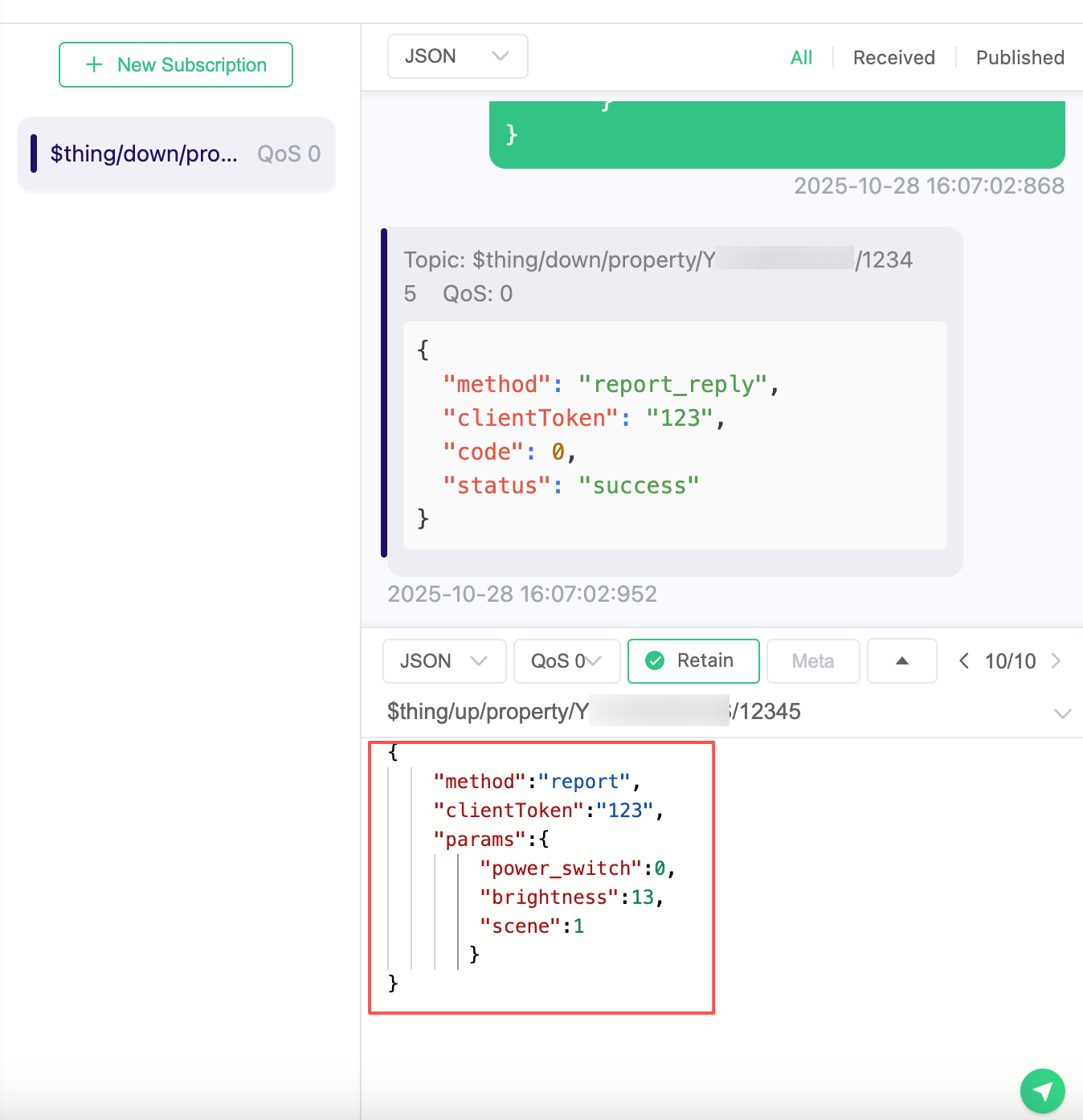 若订阅的设备消息 code 返回为0,则表示物模型属性上报成功。失败可具体参考 code 错误码。