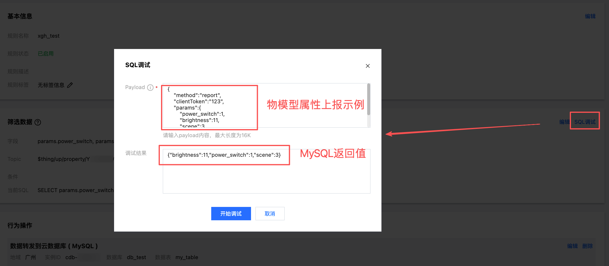 7. 确认好设备侧属性上报无误后,可在对应规则的 SQL 调试中输入 Payload 内容。参考调试结果,若结果为空则需回到第4步检查 params. 字段。结果正常如下图所示: