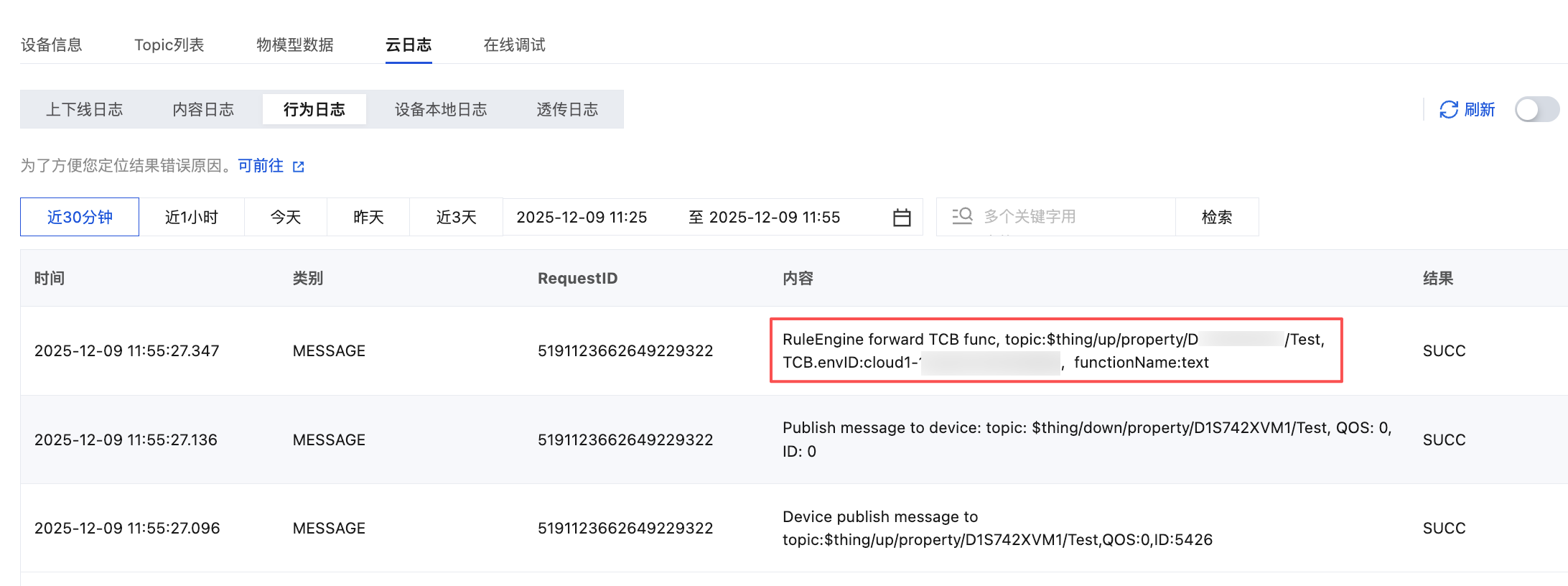 6. 根据设备的云端诊断日志来判断设备 Test 是否转发成功。