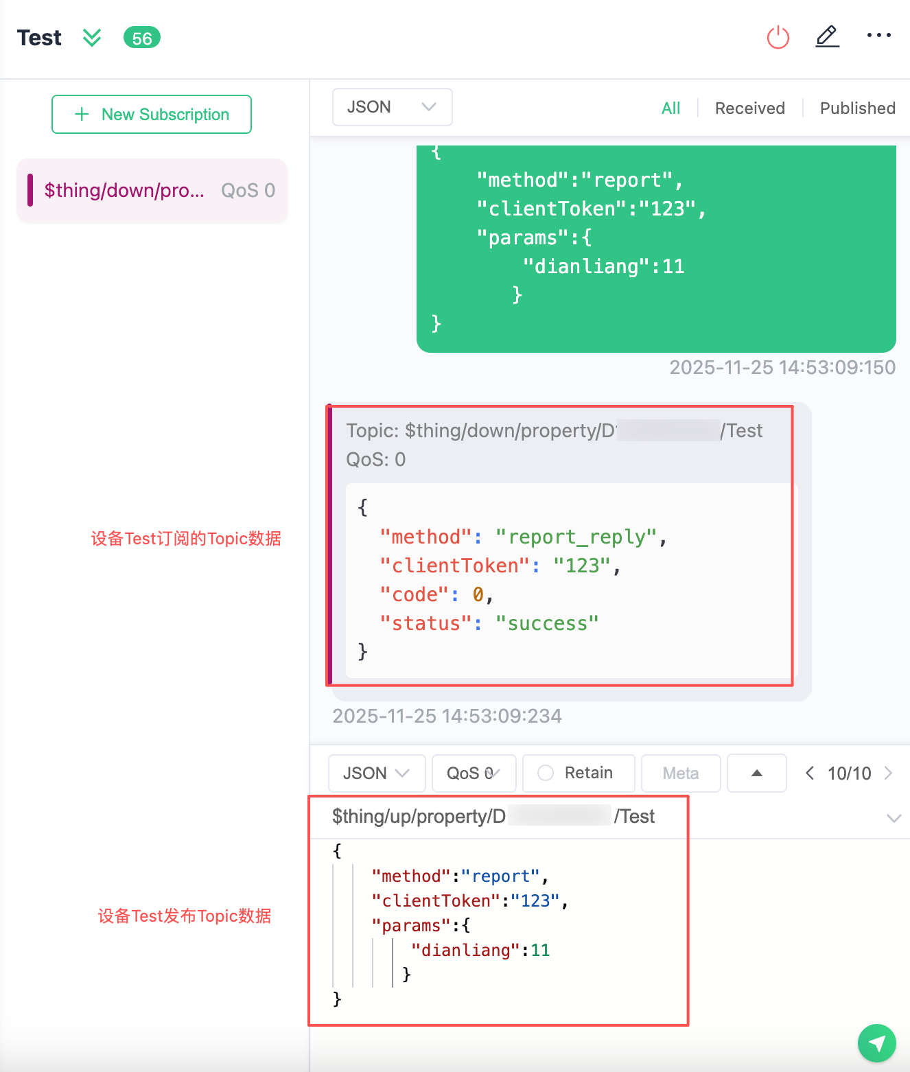 5. 用 MQTTX 工具来模拟设备上报消息,确保设备订阅的 Topic 中的 code 数据为0,其他值需核查消息内容。
