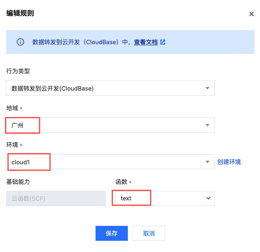 目前仅支持数据往云开发中的云函数转发,需先在云开发中建立好开发的环境与云函数,才可对环境与云函数进行选择。