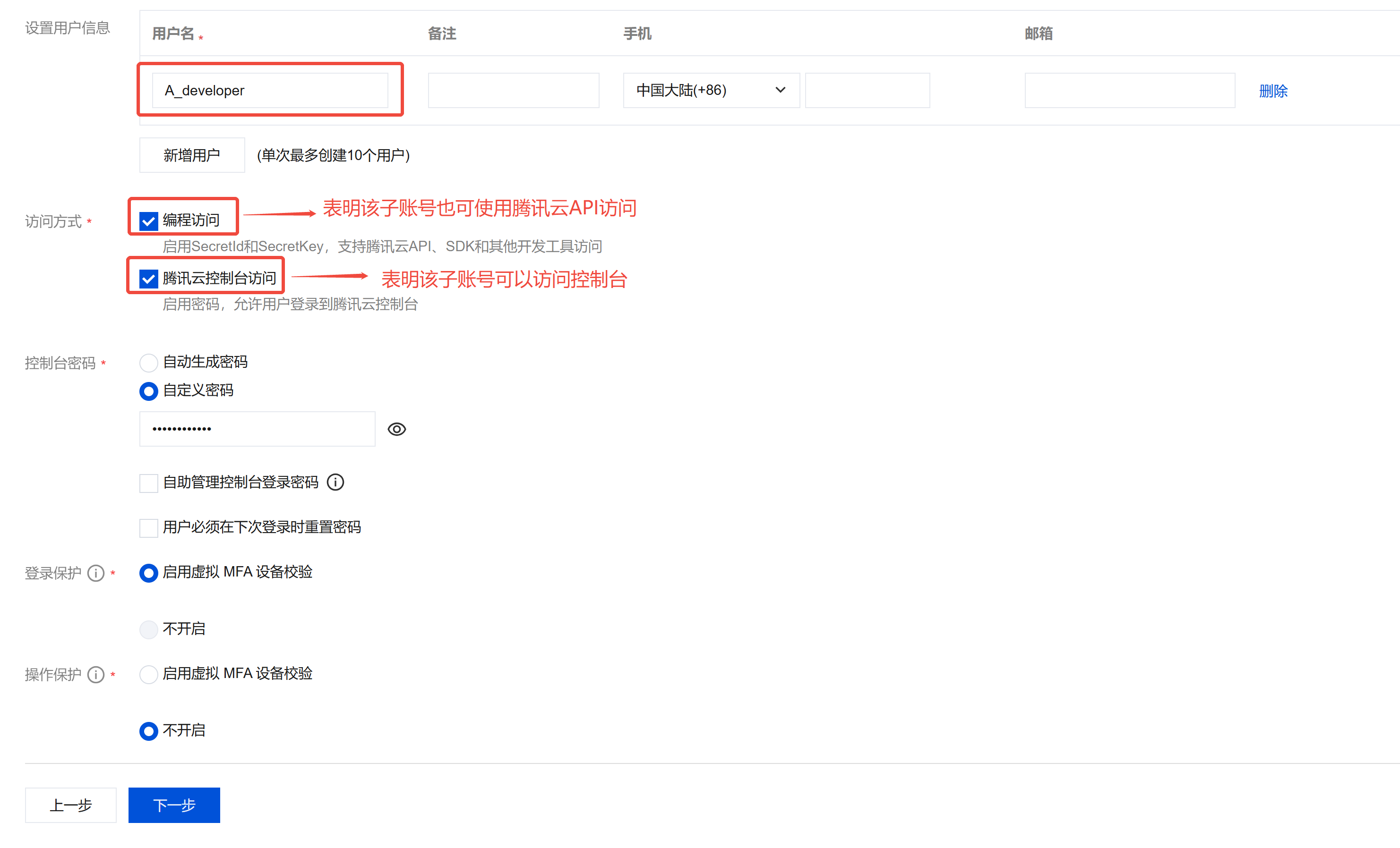 5. 填写子用户的必要信息,可以自定义“用户名”,对应手机号码,访问方式选择“控制台访问”。选择控制台访问后,需要设置该子用户的密码。如果您要通过 API 访问,则建议选择“编程访问”。如下图: