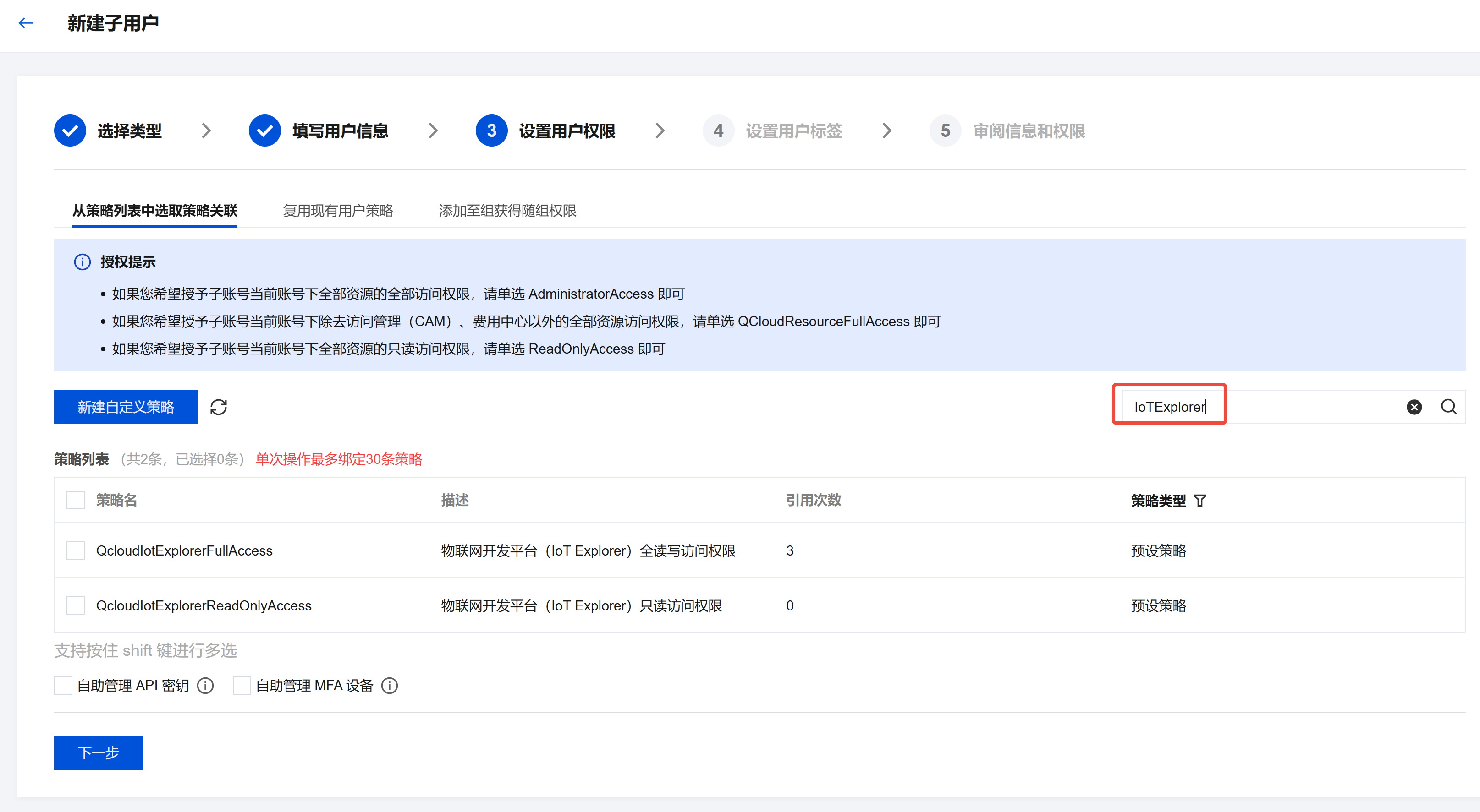 8. 勾选“QcloudIotExplorerReadOnlyAccess”策略,表示给该子用户赋予主账号权限的所有资源可读权限。若授予子账号 QcloudIotExplorerFullAccess 权限,则子账号可以查看、删除和修改主账号所看到的 IoT Explorer 平台下所有的产品、设备等数据,建议主账号仔细评估。