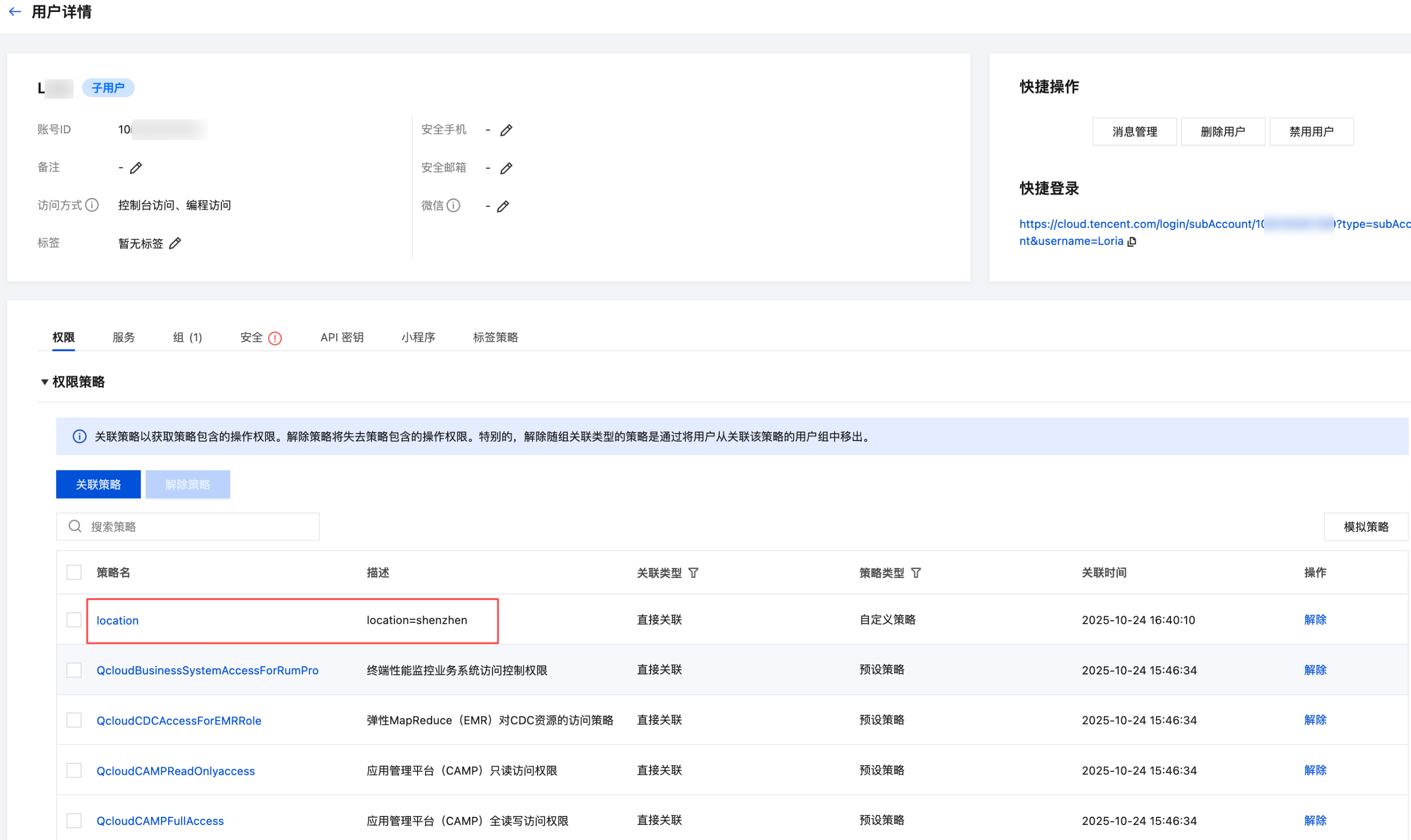 6. 进入用户列表,单击用户名即可查看该子用户下授权的权限。