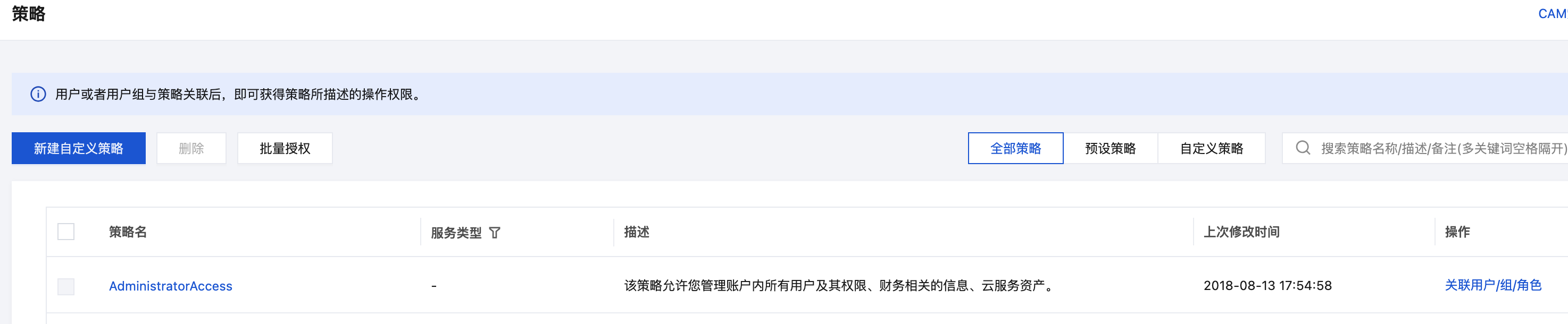 1. 登录 访问管理控制台,在左侧导航栏选择策略,单击新建自定义策略。