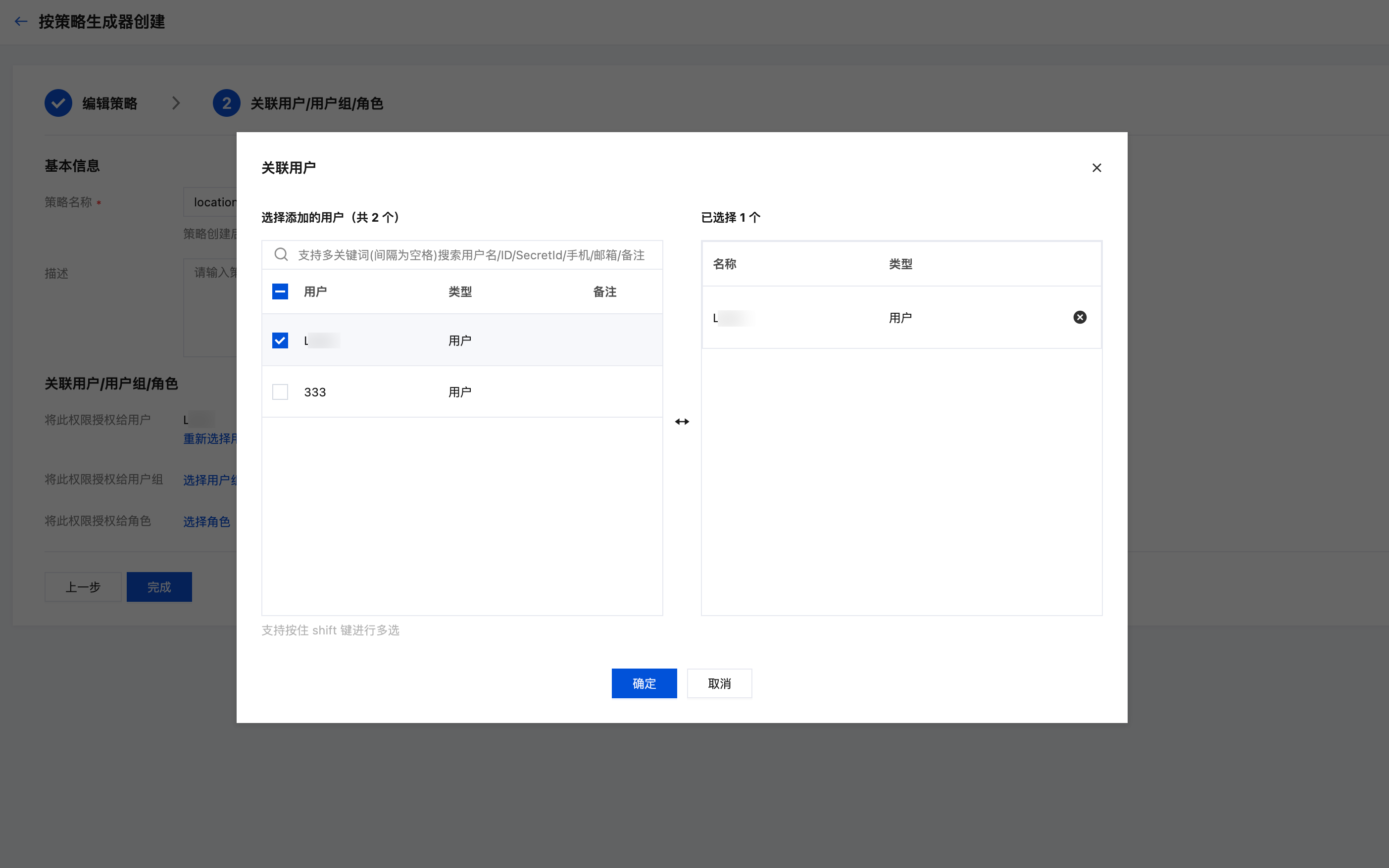 5. 选择关联用户/用户组/角色,单击确定,然后继续单击完成即代表完成子用户授权。