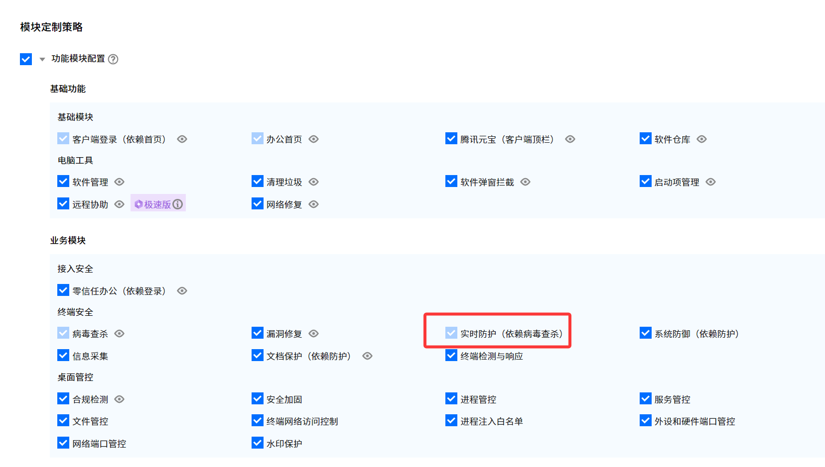1. 勾选功能模块配置,勾选需在客户端展示的基础功能/业务模块名称,单击保存。
