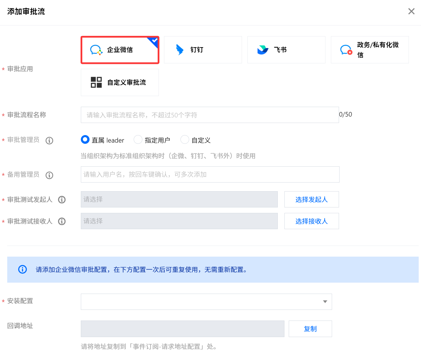 审批管理员 | 直属 leader | 自动将审批信息发送至企微中对应的 leader,此选项无法在配置页面进行测试,请在配置完成后,在对应终端上登录并进行审批测试。 |