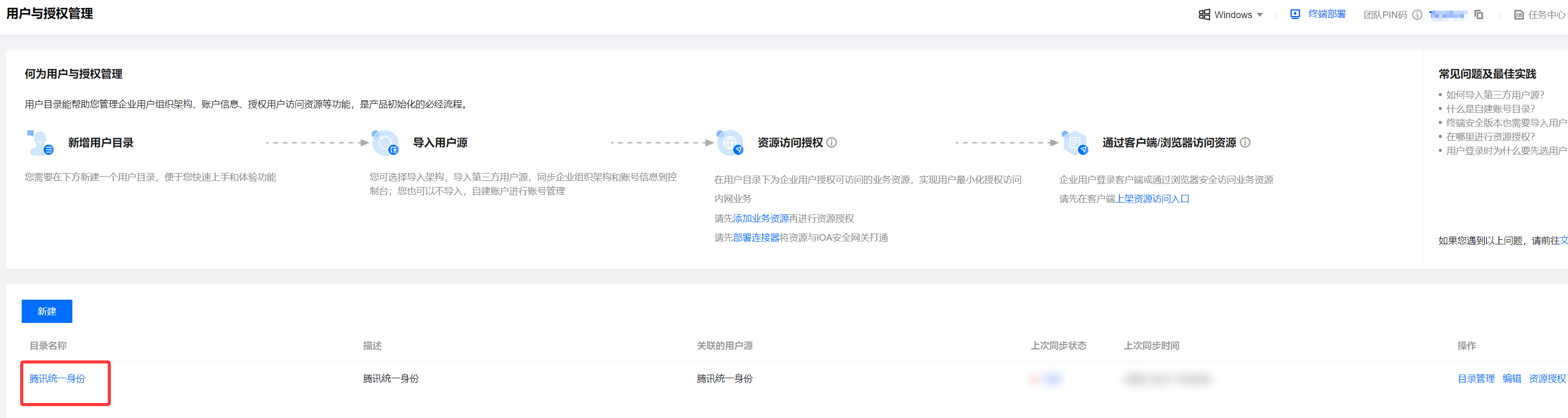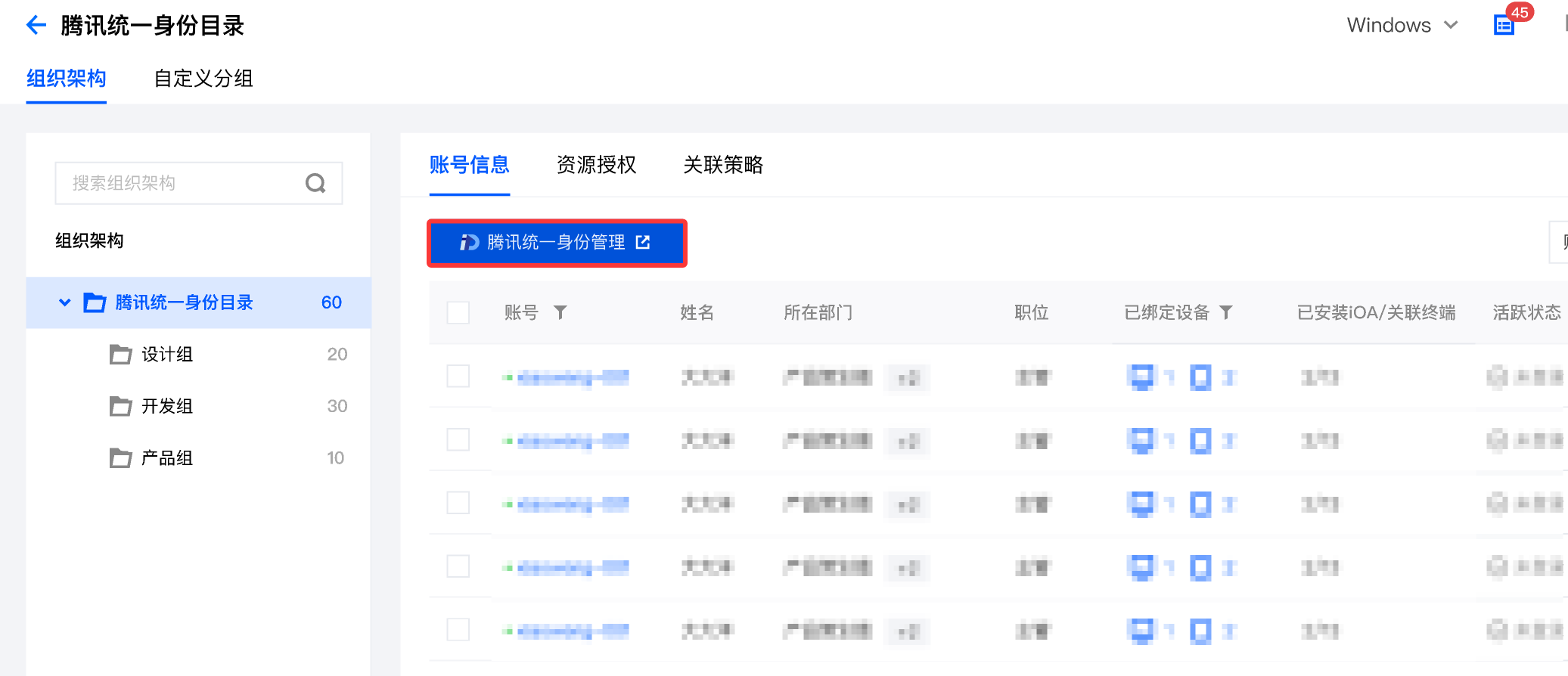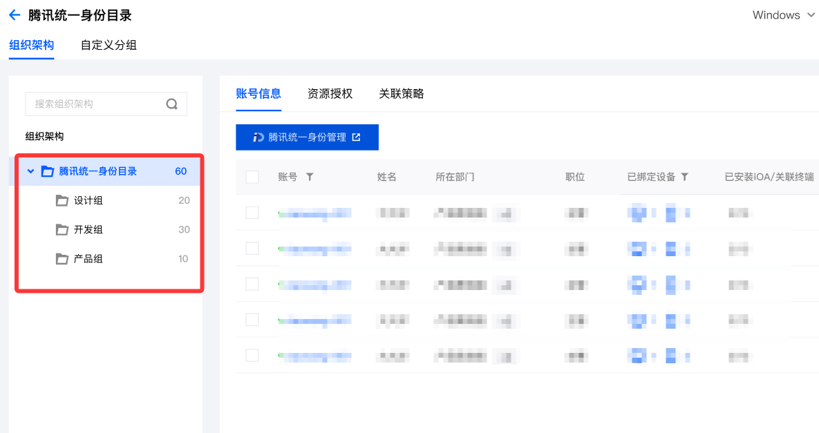 2. 在用户与授权管理页面,腾讯统一身份平台同步至 iOA 的组织架构将默认展示在 iOA 用户目录中。