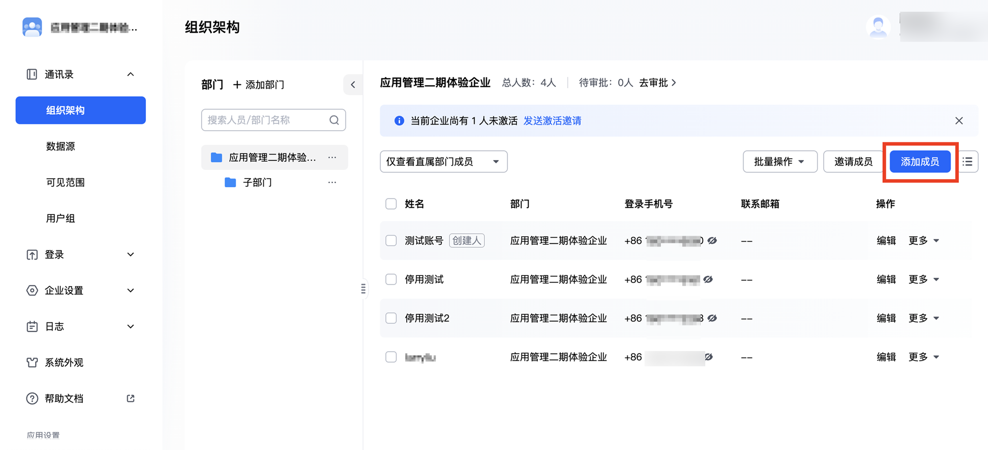 1. 在通讯录 > 组织架构中,单击添加人员。