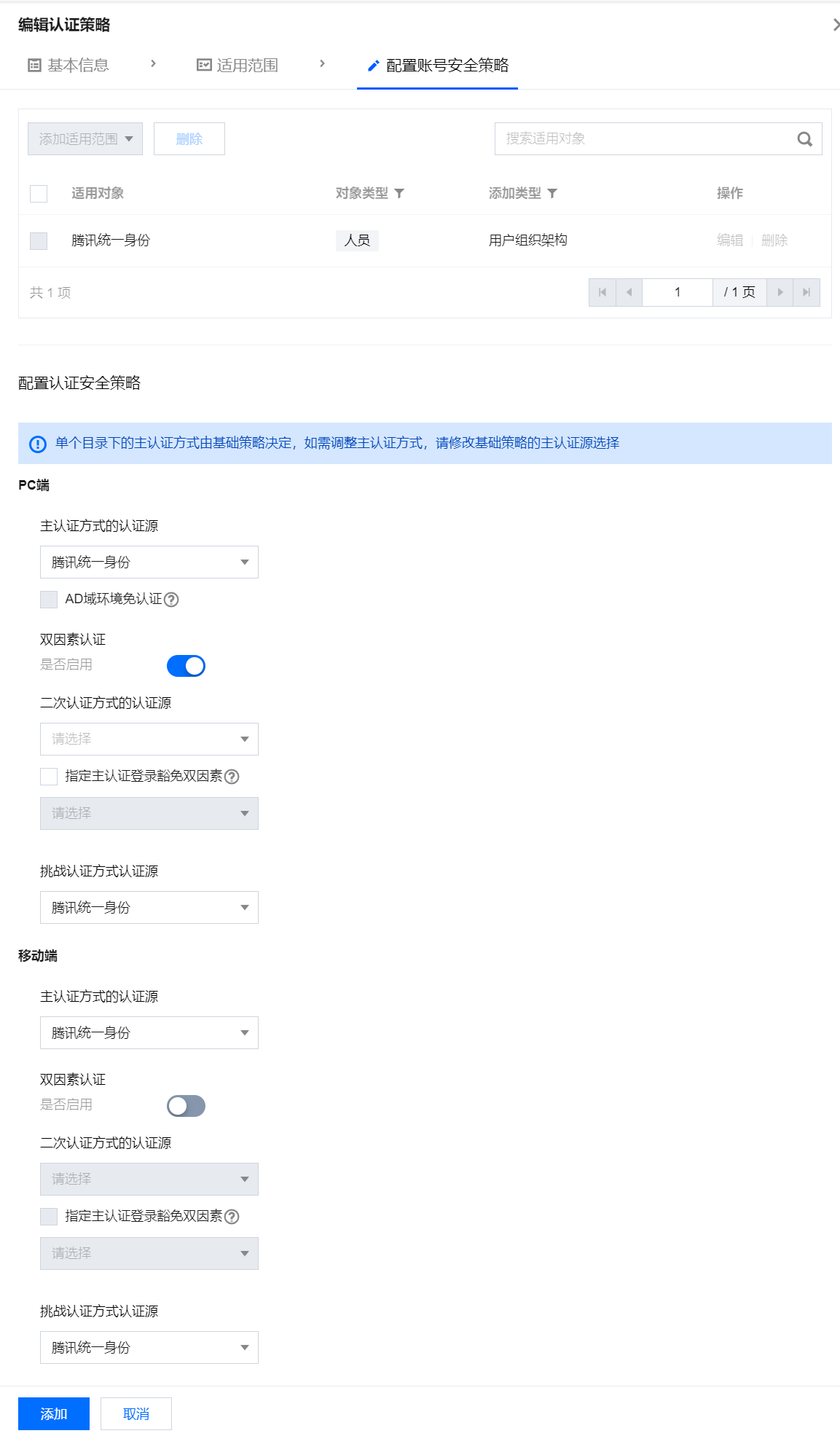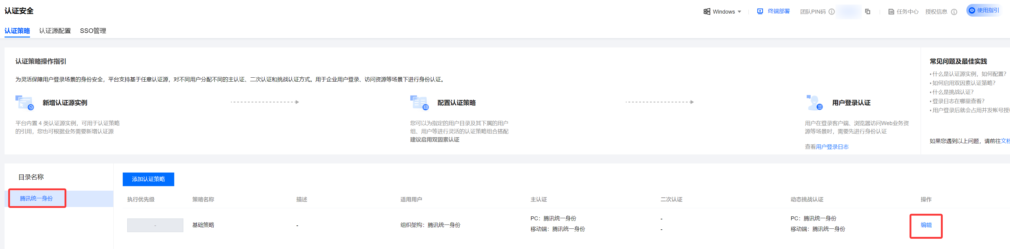 6. 支持将“腾讯统一身份平台”作为认证策略,实现腾讯统一身份登录 iOA,您可前往身份安全策略 > 认证安全 > 认证策略,配置挑战认证和二次认证。