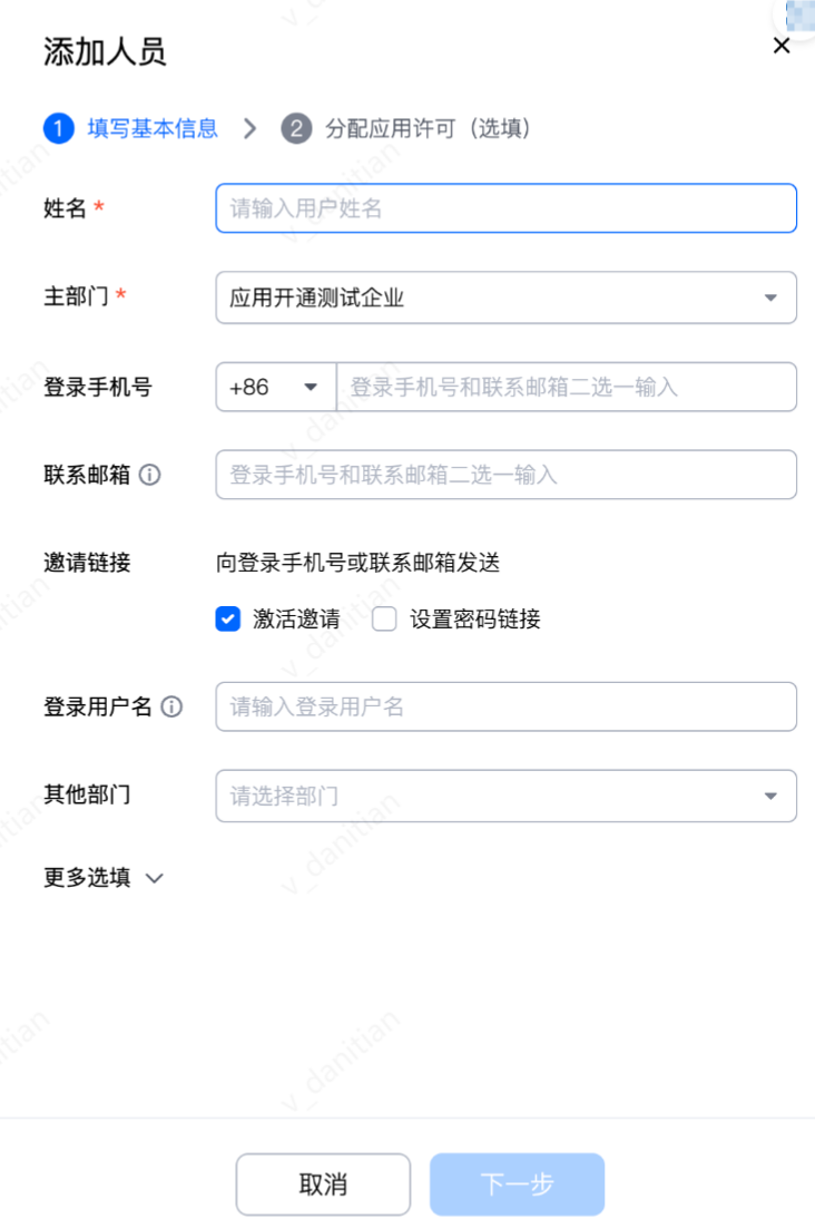 2. 在添加人员页面,填写人员姓名、主部门等信息,单击下一步。