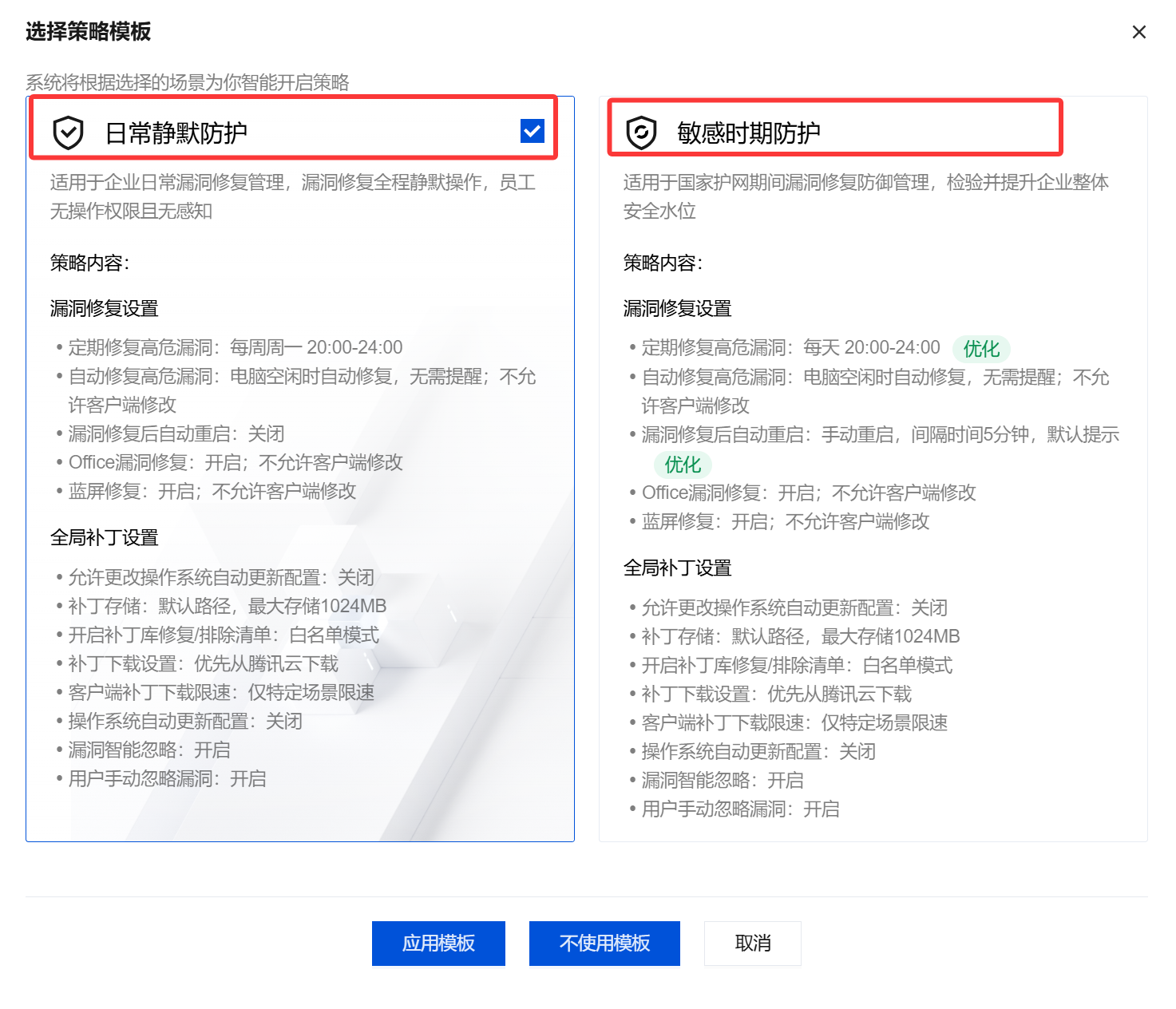 2. 根据需求,勾选日常静默防护或敏感时期防护,单击应用模板。