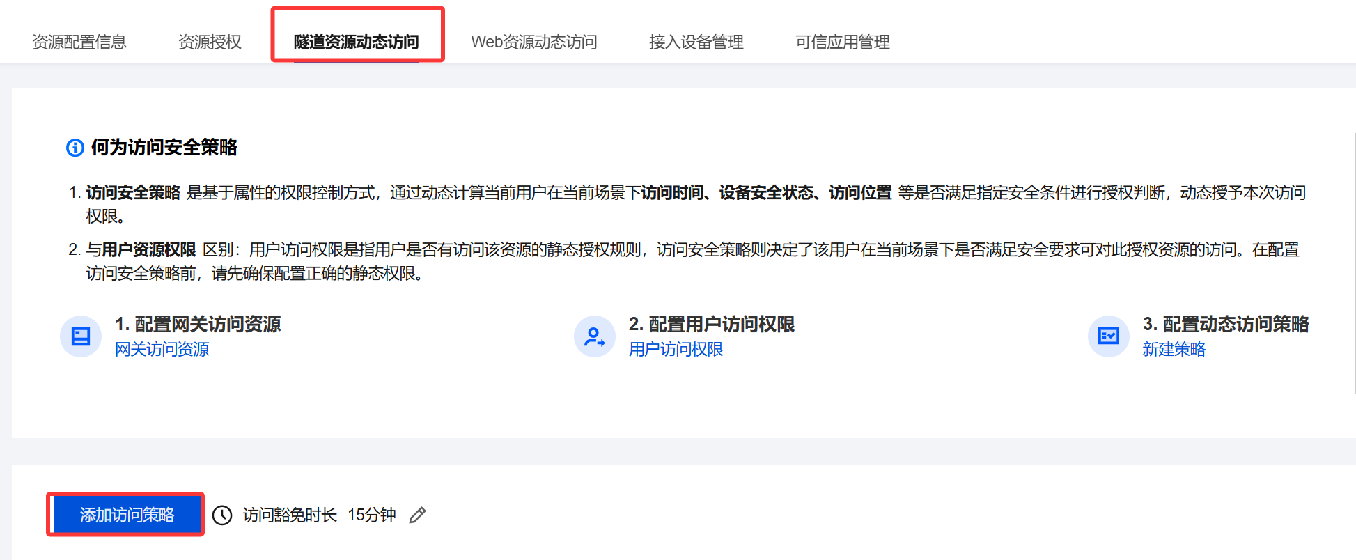 1. 登录 iOA 零信任管理平台控制台,在左侧导航栏,选择可信接入管理 > 隧道资源动态访问,单击添加访问策略。