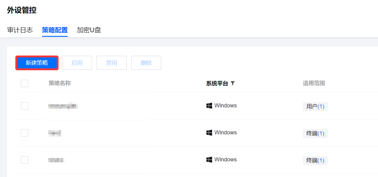 2. 在外设管控页面,选择策略配置,单击新建策略。