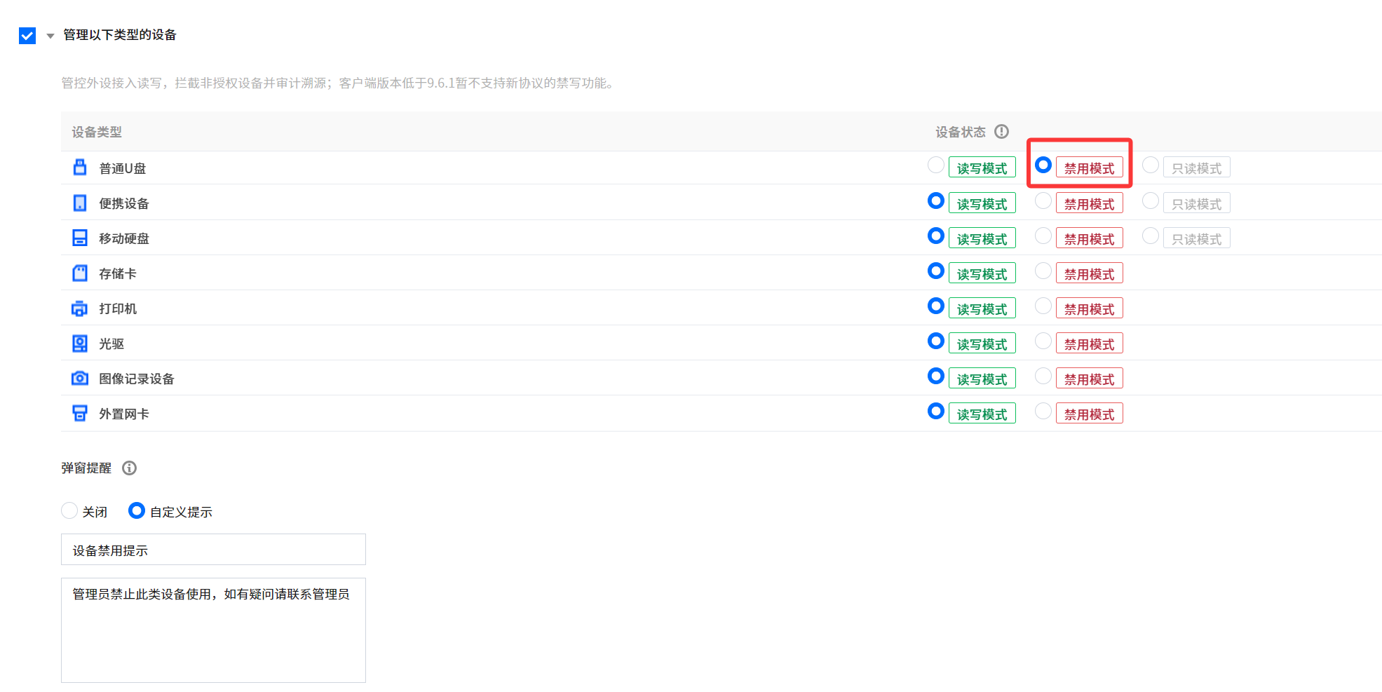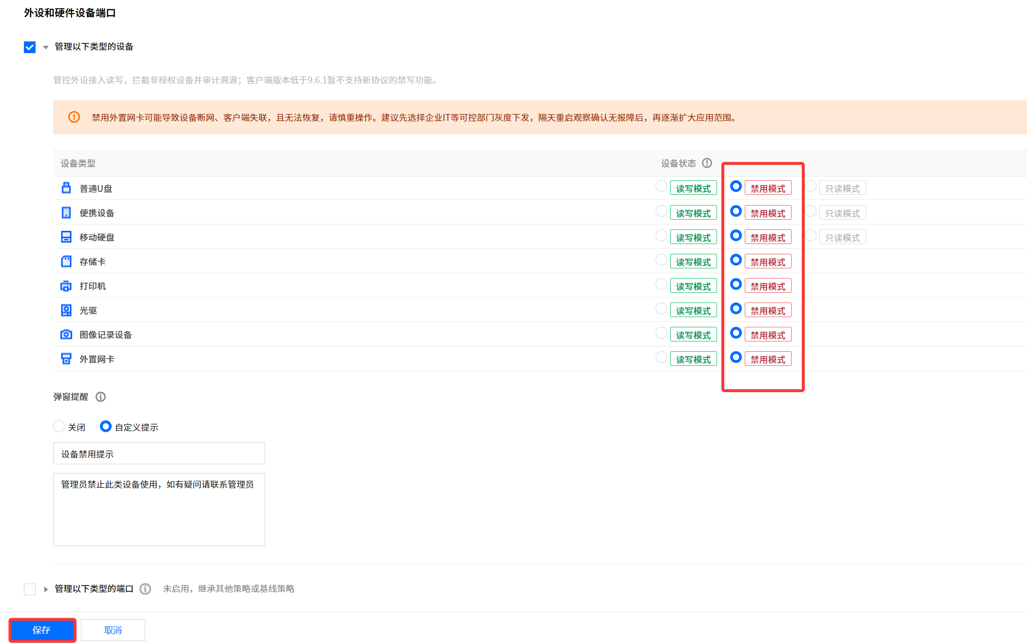 1. 在策略配置页面,勾选管理以下类型的设备,选择设备类型,将管控动作修改为禁用模式,单击保存。