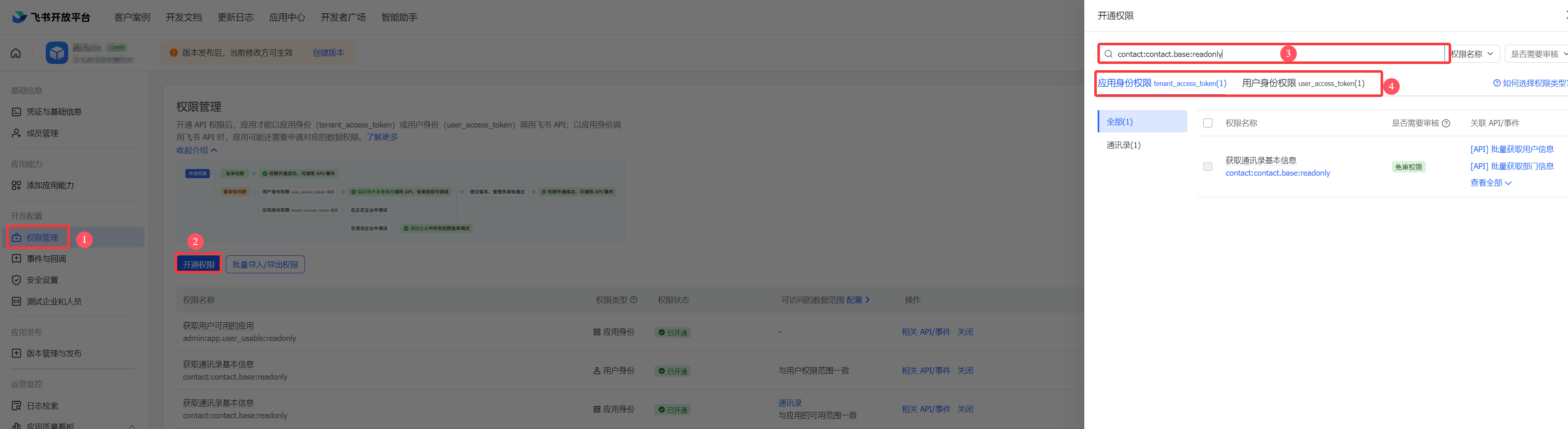 示例:查询contact:user.base:readonly,查询后在应用身份权限和用户身份权限中都存在contact:user.base:readonly,则都需开通权限。