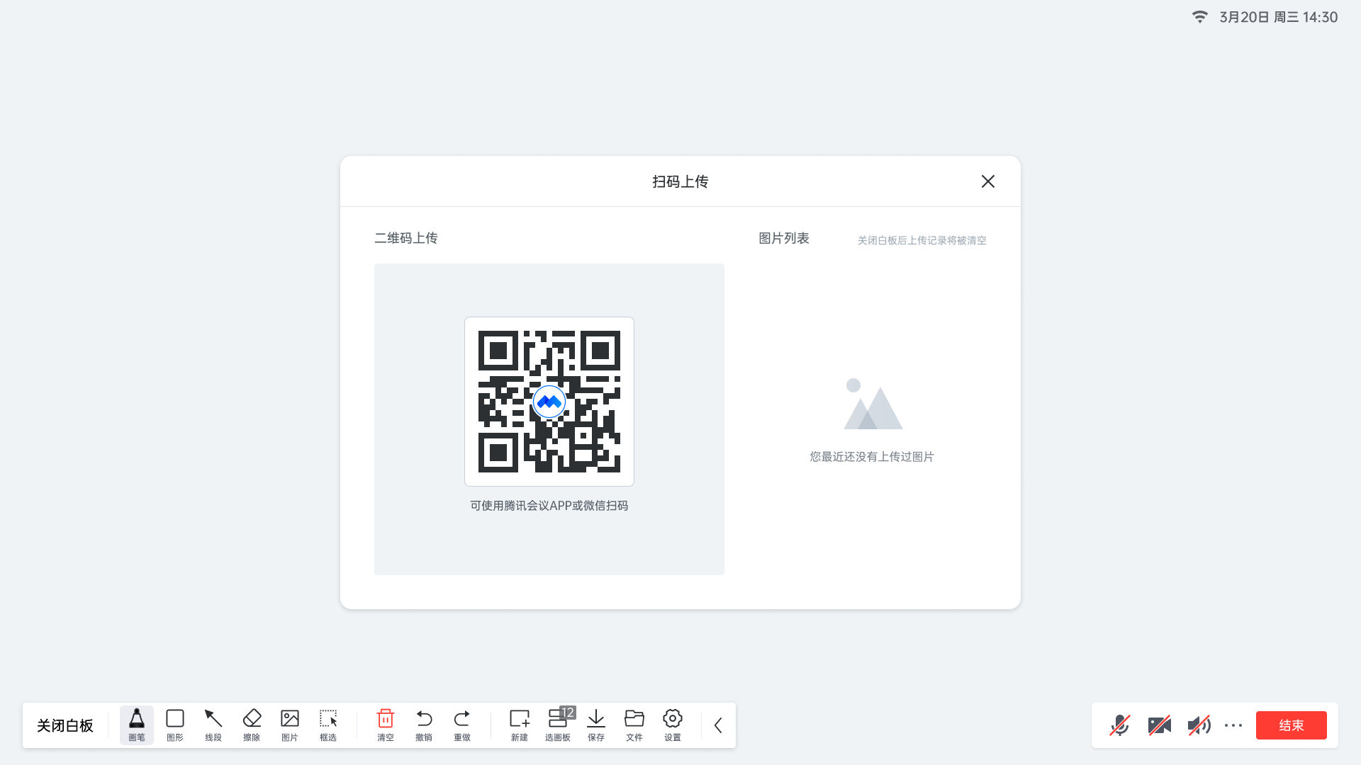 上传图片:移动端腾讯会议APP或者微信扫码上传图片至白板。