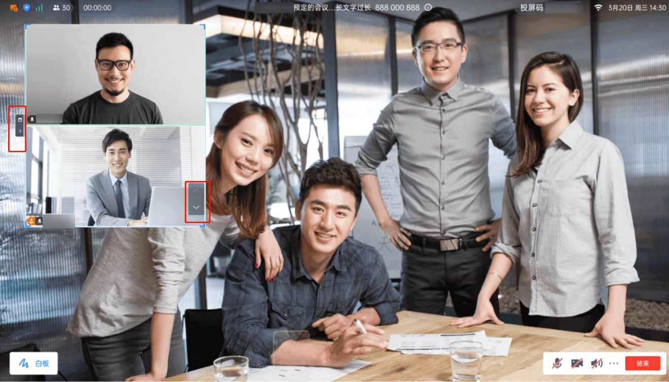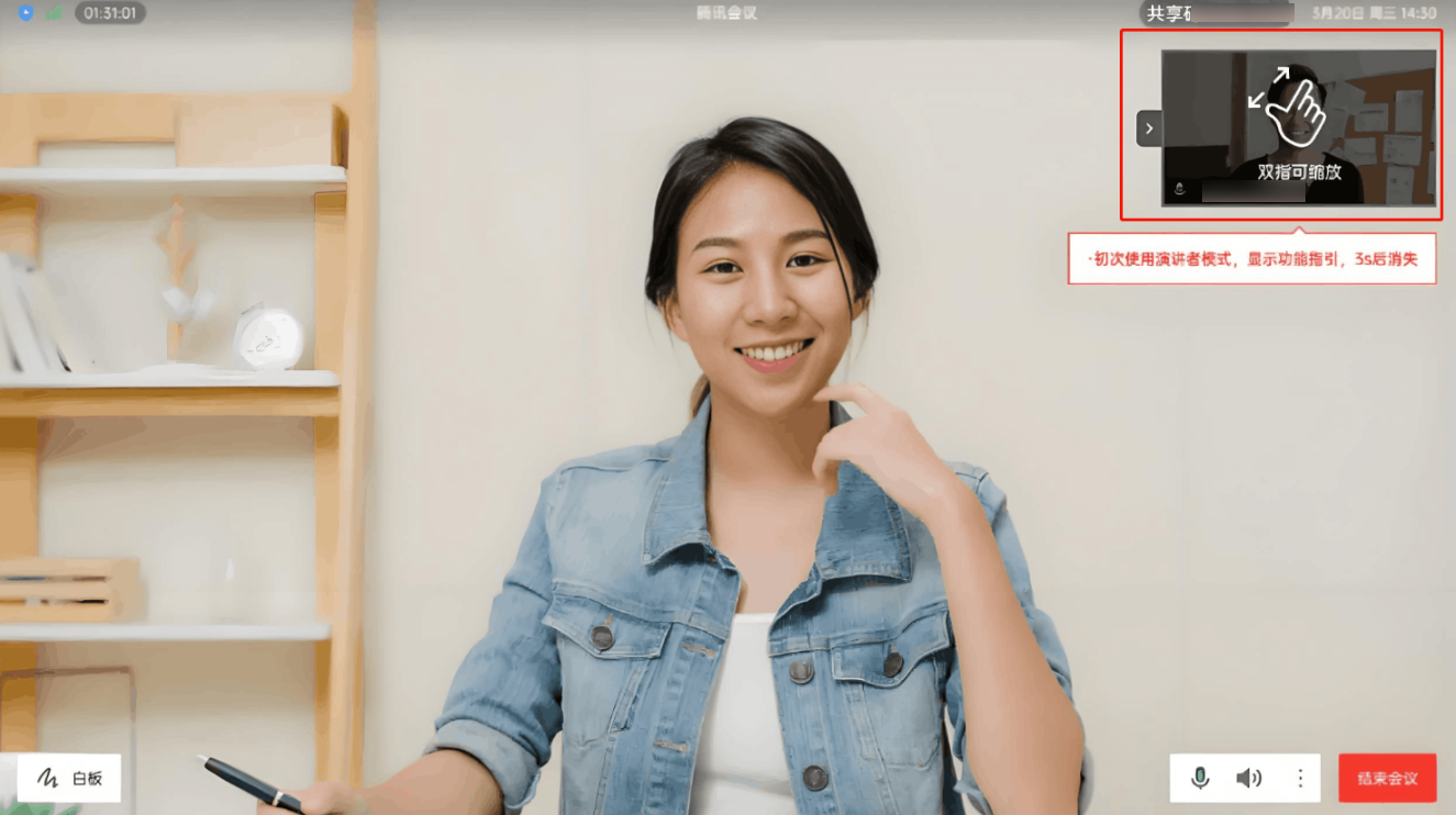 Rooms 在触屏模式的演讲者布局下,小窗可进行展开和收起列表、缩放、移动、翻页和双击支持锁定视频内容到大窗口。