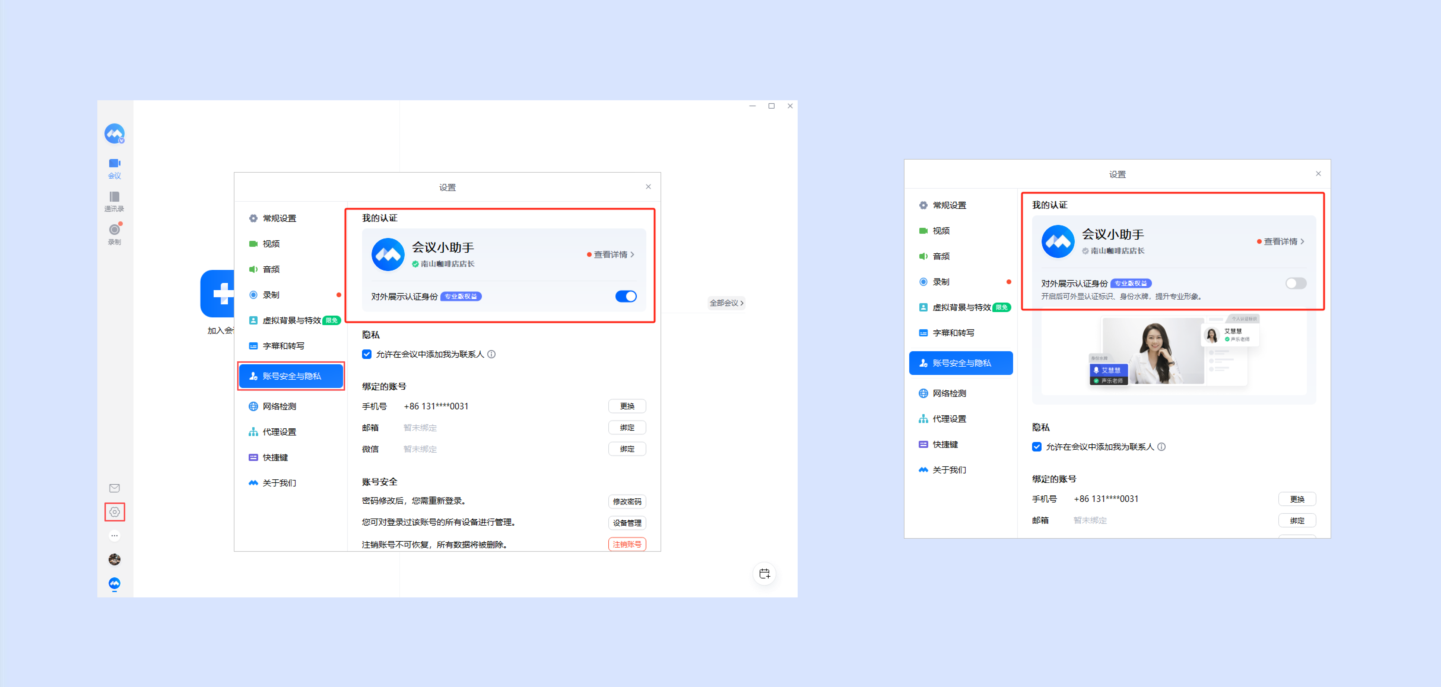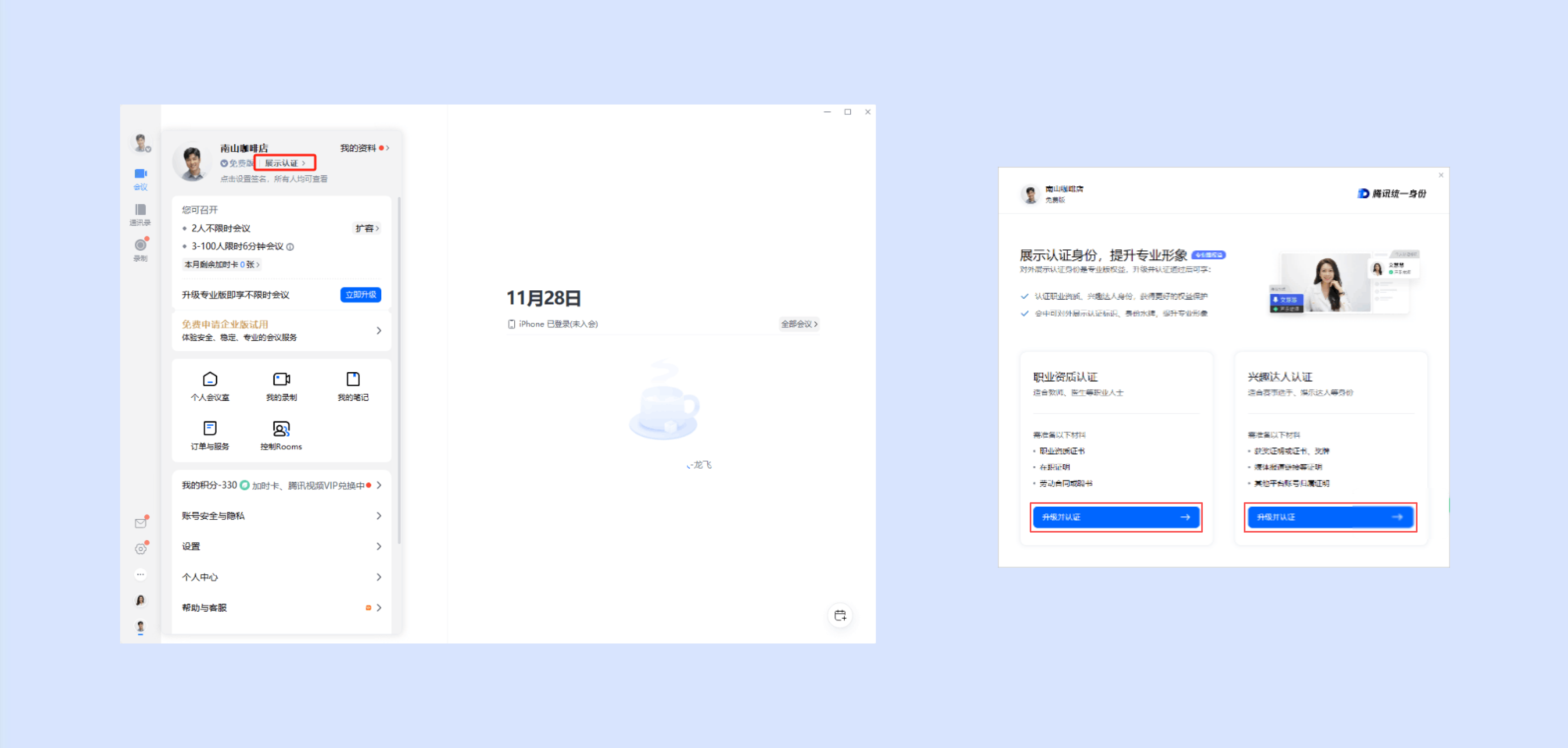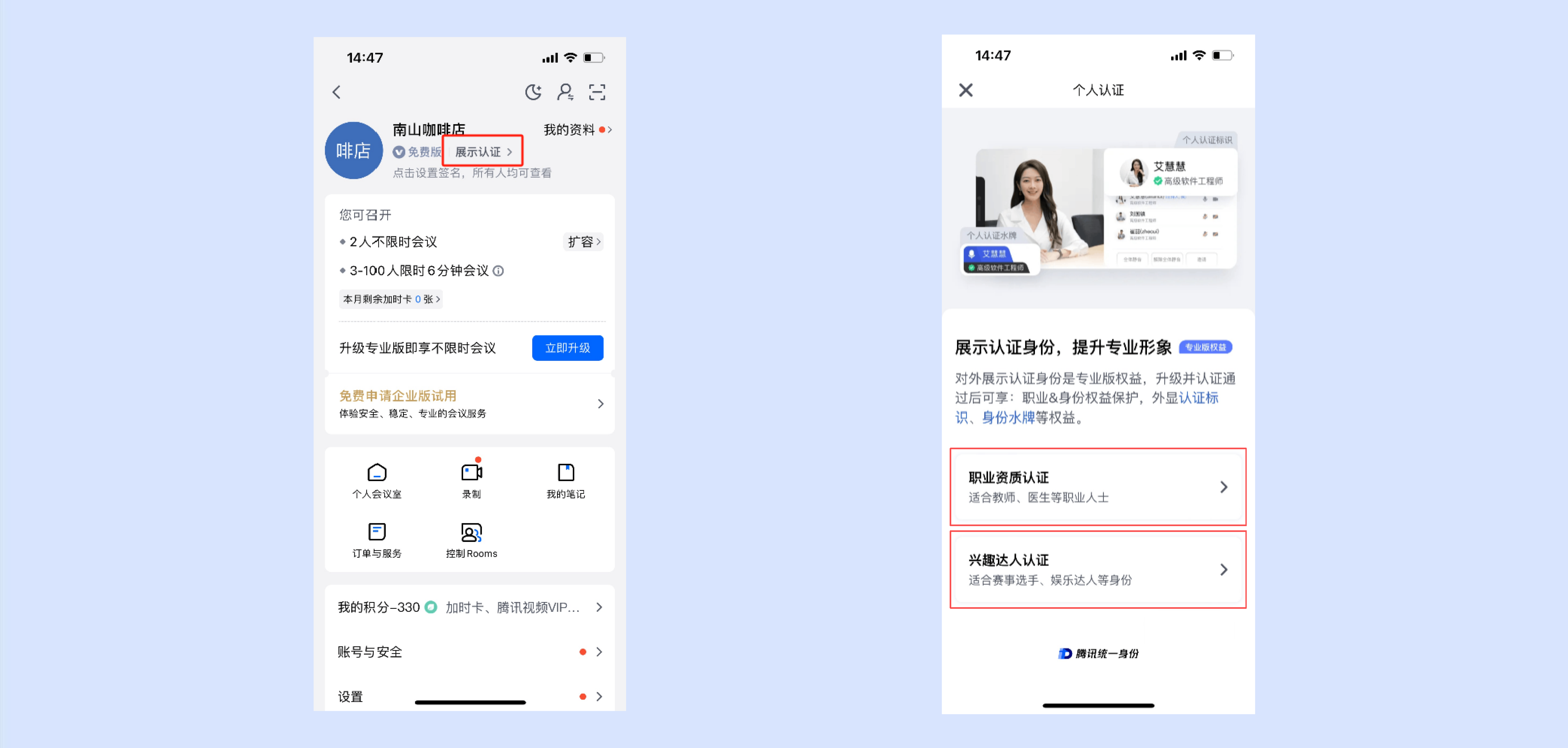 展示认证身份的好处:账号身份防冒充,获得更好的权益保护;资料卡、参会成员列表中展示认证标识,提升可信度;会中展示身份水牌,打造专业形象。